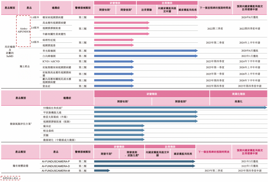 目前,鹰瞳科技的产品组合中包括用于检测及诊断的SaMD,健康风险评估解决方案及独有硬件设备。其中核心产品包括三个版本的Airdoc-AIFUNDUS,Airdoc-AIFUNDUS  (1.0)获国家药监局首张眼科AI第三类医疗器械证书;除了此次 (2.0)版本增加的三个适应症以外,Airdoc-AIFUNDUS (3.0)还将增加病理性近视、视网膜脱离两个适应症,并计划于2022年10月开始进行临床试验。