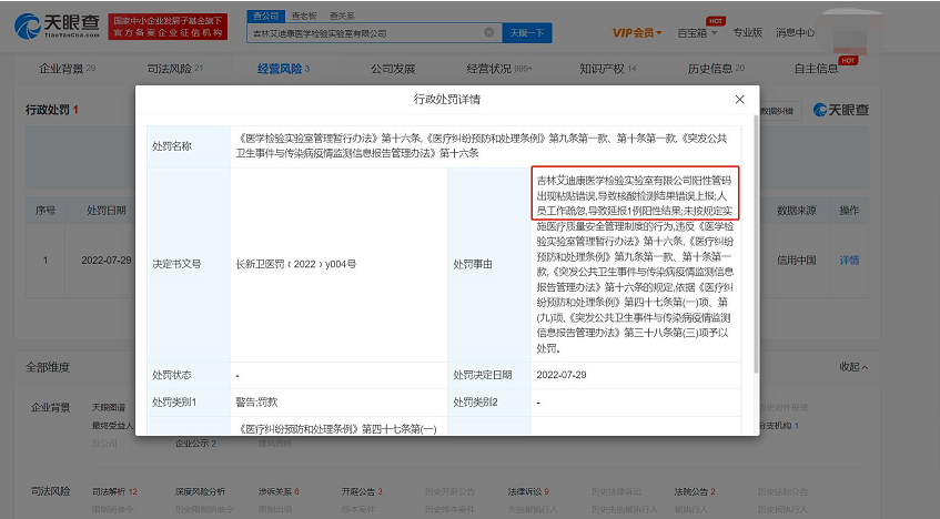 据信用中国网站通报,近日,吉林艾迪康医学检验实验室有限公司被长春新区卫生健康局警告并罚款5万元。