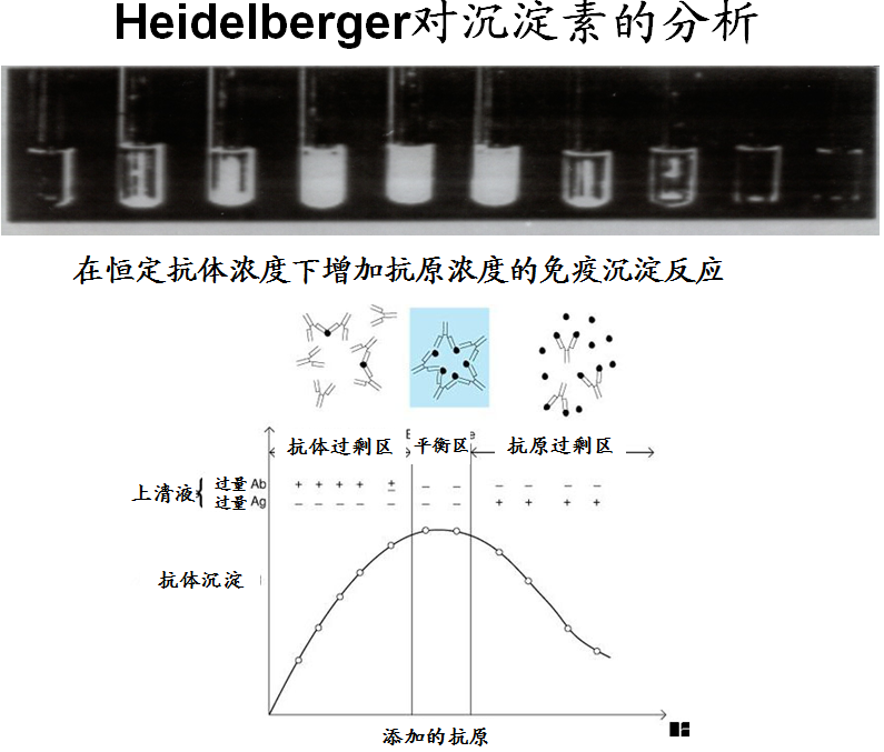 3、蛋白质检测的发展 蛋白质方法学随时间在发展,为了不同的目的应用了不同的方法。 在测定总的血清蛋白浓度上,临床上开始是检测蛋白质中氮的含量,再来推算蛋白质含量(在国内称为蛋白氮)。这就是Kjeldahl的检测氮的改良方法(凯氏定氮)。这个方法也许至今还依然使用在生物制品确定蛋白质含量。 1921年美国人Howe 叙述了使用硫酸钠溶液分离血浆蛋白为纤维蛋白原、优球蛋白(auglobulin)、和假球蛋白(pseudoglobulin)。依据较早时期的研究,优球蛋白被确定为实际上不溶于水、溶解在稀释的盐溶液(沉淀在蒸馏水中的球蛋白),但在28%~36%的饱和硫酸铵溶液中被沉淀。1937年,Campbell和Hanna引入亚硫酸钠对血液蛋白质进行分离。成为临床实验室使用的盐析经典方法,从血清中将球蛋白分离,余下的为白蛋白。在使用如双缩脲方法(或酚试剂)分别定量球蛋白和白蛋白,确定了白蛋白/球蛋白的比率(A/G)。 Tiselius在1937年叙述了在U-管中以电泳的移动界面分离蛋白。存在的浓度梯度可以折射仪检出。直至1948年开始普遍使用纸电泳进行蛋白分离。 1928年Theodor Svedberg引入分析超离心,开始以斯韦德贝里(Svedberg)常数(S)表示蛋白质的特性。据此按照蛋白质的分子量分类为4S(~65 kDa)、7S(~150 kDa)、和19S (~900 kDa)分子。γ-球蛋白组分,按照它的电泳泳动能力确定,被超离心分为7S和19S组分,7S组分含有IgG、IgA、和IgD;19S组分含有IgM。 不同的非特异方法对蛋白质的定量检测,可参见表2。 许多疾病的诊断要求更多的某些蛋白的精确浓度信息,各个人体蛋白在血浆、血清、脑脊液、和尿液中的定量检测是诊断和监视疾病与治疗有效性上的重要工具。在人体液的复杂基质中特定蛋白的定量,以特定抗体可最有效地实现。在20世纪中期,开始制备和使用抗体作为分析工具。这是在Michael Heidelberger和Forrest Kendall在1935年报告了沉淀反应的定量研究,以及RL.Libby于1938年研究了散射的免疫沉淀后。双价抗体和单价蛋白间的结合反应导至许多抗体和蛋白质分子形成了聚集体。(图3) 图3 蛋白质免疫反应聚集示意图 但是一个蛋白的抗原决定簇单价特性,可因蛋白质的重复结构,特别在多聚体蛋白内或因在一个多克隆抗血清内抗体的不同决定簇的特异性,产生了蛋白质抗原与抗体聚集不同表现。无形中,一个蛋白质的很多免疫反应决定簇,可以与各个对应抗体产生特异免疫反应。而一个蛋白质相应地,也成为了免疫学中多价的可溶性蛋白质抗原。 免疫化学分析中,一个多价的可溶性蛋白质抗原与它相应抗体(Ab)在一个免疫化学检测中的结合,是一个平衡反应,发生在系列的不同步骤,如下所述(b、d、m、x、和y为整数,且b、d<m<x、y): 1、在起始反应中,抗原Ag和抗体Ab快速结合,形成(AgAb)抗原抗体复合物; 2、形成免疫复合物AgAbm,并缓慢地增长(AgdAbm+b); 3、在免疫复合物中,抗原和抗体分子数增加,一旦达到临界大小,最后产生沉淀(AgxAby)。 在反应中分子大小实质性的增大,不仅在溶液中产生了沉淀,而且也改变了沉积和扩散系数,以及改变了光散射的行为。 Michael Heidelberger和Forrest Kendall于1935年检测了被沉淀的抗体量,第一个以定量词语叙述了“免疫沉淀反应”。在他们的实验中,他们将不断增加的抗原,加到具有相同抗体浓度的系列溶液中。 图4 在恒定抗体浓度下增加抗原浓度的免疫沉淀反应。 在抗原浓度和被沉淀的抗体间关系的一般形式,参见图4。经常被称为“Heidelberger-Kendall曲线”,可分为三个不同的区域: 1、“抗体过剩”是第一个区域(A),出现较低的Ag/Ab比率,形成少量沉淀;但随着抗原 浓度增加,发生越来越多的沉淀。 2、“平衡区带”是第二个区域(B),抗原和抗体浓度具有最佳比率。随着更多抗原与抗体结合,达到了最大形成沉淀点。在溶液中,存在很少或没有游离抗原或游离抗体。 3、“抗原过剩”是第三个区域(C),Ag/Ab比率升高。因为很高的抗原浓度,形成很小的、可溶性的免疫复合物。与较大的沉淀物相比,Ag2Ab 的整体组成更多。这些小的复合物没有大至从溶液中析出,也无法被普通的光散射检测出来。 这个曲线的原理结构展现了,每一个免疫化学反应中的特性特征。这个独特的曲线表现特别需要注意的是,无论使用散射免疫比浊还是免疫透射比浊,它们的检测信号指示了一个相同的信号读数(被抗体沉淀的),有两个可能抗原浓度;一个检测是在抗体过剩区域,另一个在抗原过剩区域。某个检测方法的抗体浓度水平被设定在抗体过剩区,确保了所有预期抗原浓度处于抗体过剩状态,这样的检测结果可靠有效。在凝胶方法的抗原单向扩散方法中,抗原向含有抗体的凝胶移动,在加样孔处表现为抗原过剩,不会出现抗原抗体复合物的沉淀。抗原向外扩散到抗原和抗体间比率变化恒定下,实现抗原抗复合物达到最大沉淀,呈直线或环状沉淀线。实验室可以测量沉淀线的直径,与标准抗原结果比较,得到样品中存在的抗原量。 这些内容很容易被大家认为没有什么价值。确实,很多内容很老了。我只是在整理中看到了以往没有认识的内容。但是,采用抗原抗体反应产生免疫复合物的方法,至今在蛋白质分析中被普遍采纳。需要有更多的了解。 E N D |