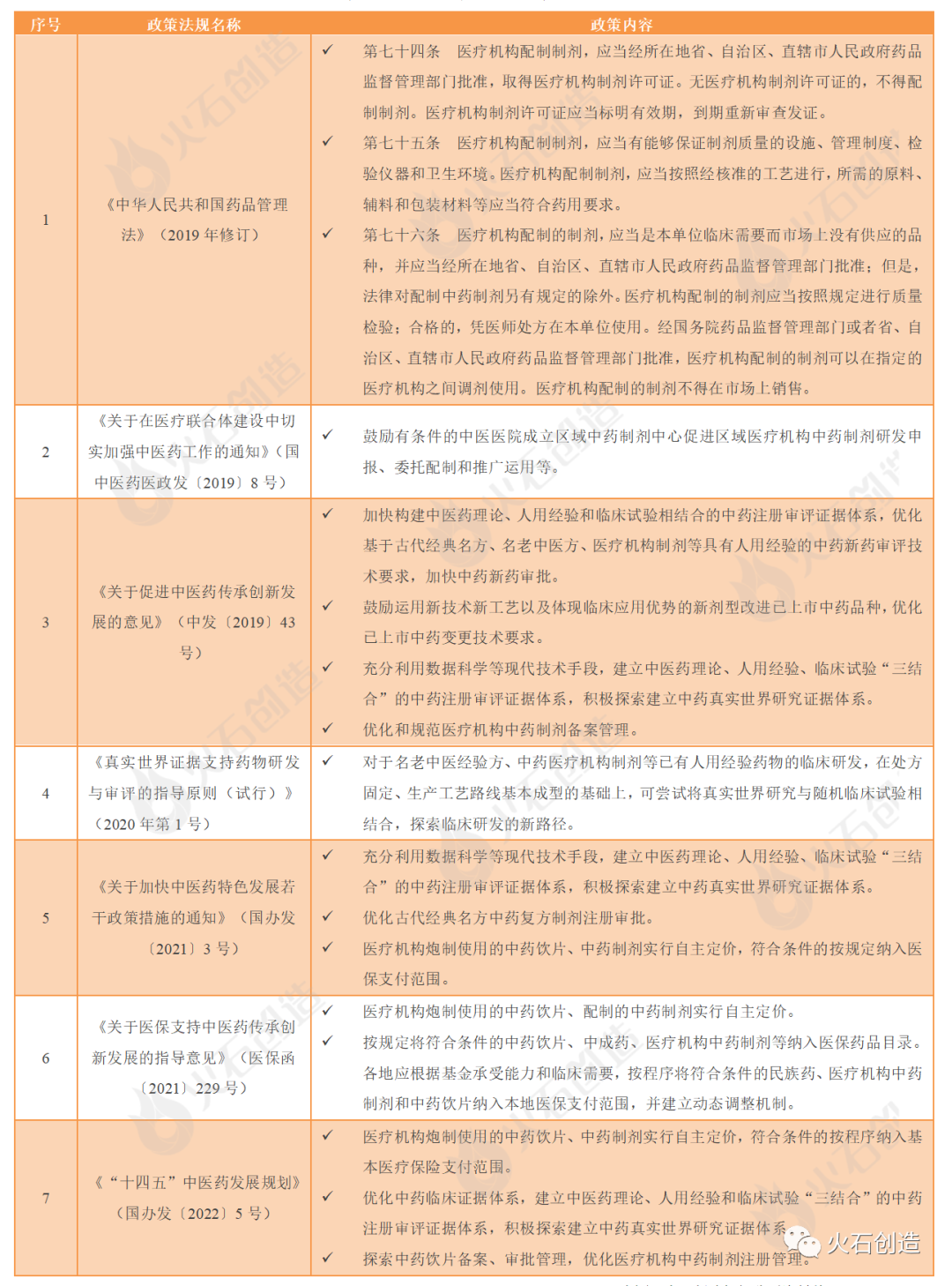 院内制剂是我国传统文化的智慧结晶和载体,是中医药特色的体现,也是中药新药创制的基础与源泉,加快院内制剂发展对促进中医药传承创新发展具有重要意义。近年来,中央地方齐发力,共同推动院内制剂发展进入快车道。 1 自2017年《中华人民共和国中医药法》颁布以来,国家层面密集出台中医药相关政策文件,并在系列文件内对院内制剂发展作出相关引导支持与决策部署,为院内制剂发展指明了方向、带来了机遇。 研发创新方面,鼓励探索研发新路径 《真实世界证据支持药物研发与审评的指导原则(试行)》明确提出,对于名老中医经验方、中药医疗机构制剂等已有人用经验药物的临床研发,在处方固定、生产工艺路线基本成型的基础上,可尝试将真实世界研究与随机临床试验相结合,探索临床研发的新路径。《关于在医疗联合体建设中切实加强中医药工作的通知》提出,鼓励有条件的中医医院成立区域中药制剂中心,以区域中药制剂中心促进区域医疗机构中药制剂研发申报、委托配制和推广运用。 注册审批方面,在规范化前提下逐步放宽 《关于促进中医药传承创新发展的意见》提出“加快构建中医药理论、人用经验和临床试验相结合的中药注册审评证据体系,优化基于医疗机构制剂等具有人用经验的中药新药审评技术要求,加快中药新药审批”,明确人用经验可以作为中药注册审评证据体系及中药新药审评技术要求,打破了中药长期套用化药审评标准的“僵局”。《关于加快中医药特色发展若干政策措施》和《“十四五”中医药发展规划》提出“积极探索建立中药真实世界研究证据体系”,明确真实世界研究证据可作为中药注册审评证据,并提出优化医疗机构中药制剂注册管理和古代经典名方中药复方制剂注册审批。 调剂使用方面,由严格控制转向“批准即可” 2019年修订的《中华人民共和国药品管理法》第七十六条规定:“经国务院药品监督管理部门或者省、自治区、直辖市人民政府药品监督管理部门批准,医疗机构配制的制剂可以在指定的医疗机构之间调剂使用”,相较于2015年修订版的第二十五条,删除了“特殊情况下”的规定,有效促进中药制剂在区域医疗机构推广运用,推动院内制剂行业规模化发展,切实提升医疗联合体建设中中医药服务能力。 定价销售方面,自主定价和纳入医保支付范围将有效激发院内制剂发展积极性 一方面,新医改药品零加成背景下,《关于医保支持中医药传承创新发展的指导意见》明确提出,医疗机构炮制使用的中药饮片、配制的中药制剂实行自主定价,相较于正规渠道采购中药饮片顺加不超25%销售和非饮片的中药严格按照“零差率”销售,院内制剂将成为新增长点,迎来发展黄金期;另一方面,《关于加快中医药特色发展若干政策措施的通知》《关于医保支持中医药传承创新发展的指导意见》和《“十四五”中医药发展规划》均提出,将符合条件的医疗机构中药制剂按程序纳入医保支付范围,为院内制剂发展提供更为广阔的发展空间和使用空间。 来源:火石创造根据公开资料整理 2 作为中药新药创新的源头与发展路径之一,随着国家层面利好政策的密集出台,院内制剂逐步迈入创新加速期。各地政府多措并举,助力院内制剂研发与转化,为中医药传承创新发展打下坚实基础。 贵州:建设中药院内制剂中心,加速院内制剂产业化步伐 贵州省围绕院内制剂开发和推广使用,以三级甲等中医院为重点,持续推动省级区域中药制剂中心建设,旨在为制剂研发和制剂的有效性、安全性与稳定性创造保障条件,从而鼓励医疗机构制剂向中药新药转化,助力中药研发制造能力提升,加速院内制剂产业化步伐,推动其标准化、规模化、现代化发展。已启动贵州省中医优势专科建设工程省级示范性中医经典病房及中药制剂中心项目,支持贵州中医药大学第一附属医院、第二附属医院和遵义市中医院等三级甲等中医院建设省级示范性中药制剂中心。 浙江:开展“千方百剂”项目路演,加快院内制剂科技创新与成果转化改革探索 为加快推进浙江国家中医药综合改革示范区建设,按照省委主要领导关于加快医疗机构制剂研发、高水平推动科技成果转化和产学研合作的要求,浙江省持续加大中医药科技创新和成果转化力度,重点结合“中医处方一件事”改革,开展“千方百剂”项目建设,即遴选1000个富有“浙派中医”特色的名老中医协定方,研发100个疗效显著的医疗机构中药制剂,大力推动医疗机构中药制剂的研发转化工作,推动医疗机构中药制剂踏上更高台阶。同时,开展制剂数字编码工作,以数字化手段赋能制剂工作发展。 广东:或将从“审批”走向“备案”,更好规范和引导院内制剂研发与转化 为鼓励医疗机构积极研发、申报院内制剂,推动院内制剂创新发展,广东省药监局积极谋划布局。2022年3月,广东省药品监督管理局公开征求《广东省药品监督管理局医疗机构制剂注册与备案实施细则(征求意见稿)》意见,意见明确提出将中药制剂委托配制由许可制变更为备案制,同时,进一步拓展制剂备案范围、优化审批服务、延长注册批件有效期、扩大调剂使用范围、鼓励人用经验研究,并允许医疗机构制剂的持有人的变更,从多个维度持续为院内制剂发展注入活力,为院内制剂向新药转化打下基础。 3 央地持续发力,聚焦研发转化、生产制造、