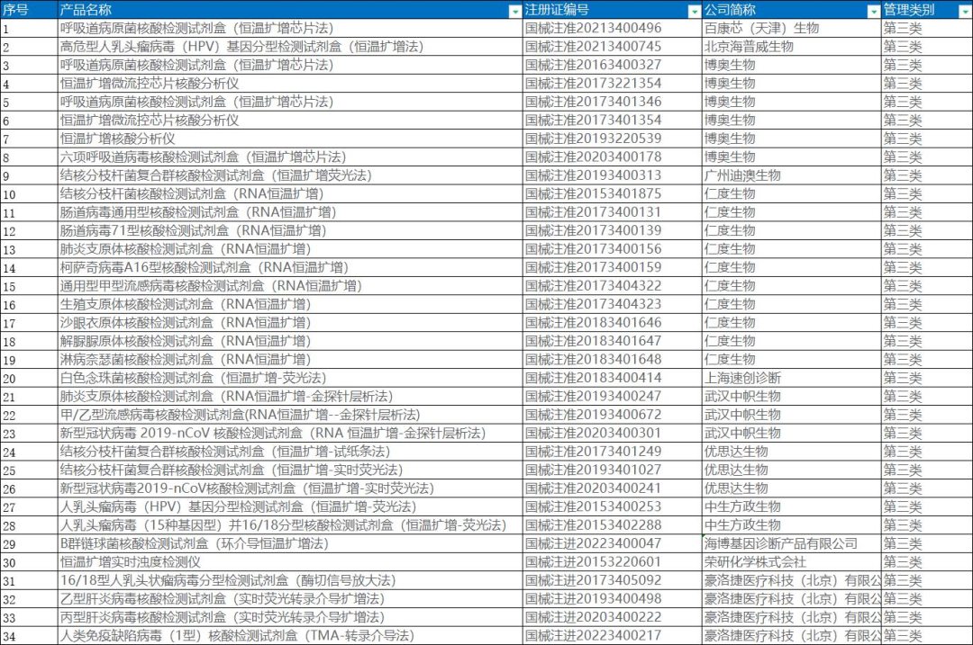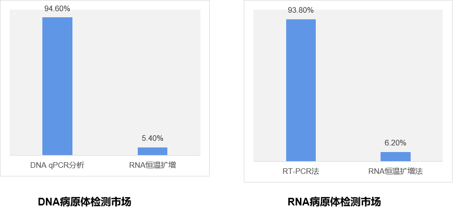 分子诊断市场分析 目前全球分子诊断市场规模不断增大,市场增速高于体外诊断市场平均增速。根据沙利文的报告,全球分子诊断市场规模:2019年约71亿美元,预计2024年市场规模将达到122亿美元,年复合增长率将达到 11.3%。其中,我国分子诊断市场规模:2019年约84 亿元,预计2024年市场规模将达到277亿人民币,2019-2024年的年复合增长率将达到27.0%。 2015-2024年全球与中国分子诊断市场规模分析 (仁度生物招股书) 按照分子诊断在临床的应用场景来看,主要分为感染检测、肿瘤检测、妇幼健康等领域,其中感染检测板块是最大的单一细分市场,包括血液传播疾病、HPV感染疾病、呼吸系统感染疾病和性传播疾病等领域,特别是新冠疫情的影响,感染检测在2020年-2021年呈现爆发趋势;而第二大市场为肿瘤检测且未来市场增速较快,主要是因为国人寿命的增加,发病人群基数大;其他板块主要是妇幼健康领域包括遗传病、生殖健康相关的检测。 2015年-2023年中国分子诊断市场规模 (仁度生物招股书) 在感染检测领域,目前临床上做核酸定量分析的技术主要包括qPCR检测技术、RT-PCR技术、RNA恒温扩增法等,主要是指通过检测DNA、RNA等物质来了解体内感染病原体的载量和基因型的变化。相较于 20 世纪 80-90 年代出现的DNA分子诊断,RNA分子诊断技术出现的时间更晚,目前市场认知度较低,在2019年,中国感染分子诊断领域RNA分子诊断(恒温扩增法)占比仅 6%。 感染检测技术介绍 qPCR技术的原理是通过控制温度的变化来实现DNA扩增,可表述为变性、退火、延伸三个步骤的循环,经过20-40个循环可扩增得到大量位于两条引物序列之间的DNA片段。PCR技术依赖于精良的仪器设备,不利于现场诊断试剂的开发和利用,使得以PCR为基础的核酸扩增检测技术无法更为广泛的推广和应用。RT-PCR技术是在qPCR基础上增加反转录的过程。 qPCR(聚合酶链式反应)技术的基本原理 RNA分子诊断是以RNA为检测靶标的分子诊断新技术,与传统DNA分子诊断技术相比,灵敏度更高,特异性更强,可以广泛应用于临床医学检测、血液筛查、食品安全检测和传染性疾病防控。因为RNA相较DNA检测的要求更高些,可以更好识别病原体在体内的活跃状态,是既往感染,还是近期感染。所以,在终端的收费,RNA检测收费相较于DNA检测的收费更高些。 部分省份恒温扩增或RNA检测收费 核酸恒温扩增技术是一系列能在某一恒定的温度下,应用不同的原理和方法,扩大特定DNA或RNA片段拷贝数的分子生物学技术的总称,属于核酸扩增技术(NAAT)范畴。核酸恒温扩增技术其独特的优势是反应不需要温度循环,在某一恒定温度下即可实现目标核酸序列的扩增。核酸恒温扩增技术的特点使它们对仪器的要求简单,反应的时间缩短。 恒温扩增与qPCR技术的区别与联系 恒温扩增技术可以分成两类,第一类是扩增反应依赖于特异性引物延伸;第二类是扩增反应依赖于限制性内切酶。 常见恒温扩增技术 在国内RNA恒温扩增技术之中,根据沙利文2019年数据,仁度生物SAT技术市场份额为34.8%;豪洛捷TMA技术(美国公司)市场份额为34.8%;武汉中帜T7 RNA 双扩增技术市场份额为10.5%。在国家药监局网站,通过“恒温扩增”关键字检索,NMPA获批的恒温扩增试剂盒简单统计如下: 企业代表 仁度生物 http://www.rdbio.com 上海仁度生物科技股份有限公司(股票代码:688193),成立于2007年,是国内最早一批专注于 RNA 恒温扩增技术和产品的生命科学企业之一,开发了 RNA 实时荧光恒温扩增技术平台(SAT平台),基于SAT技术的分子诊断产品可广泛应用于临床检测、血液筛查、食品安全检测、传染性疾病的应急防控和快速反应等多个领域。 分子诊断试剂盒种类 2017年推出全自动核酸提取仪(NAPure96)产品;2019 年推出公司核心仪器产品“全自动核酸检测分析系统(AutoSAT)”,AutoSAT是目前首台国产高通量、全自动、具有随到随检和急诊功能的RNA核酸检测分析系统。 豪洛捷 http://www.hologic.com.cn 豪洛捷于1985年在美国成立,总部位于美国马萨诸塞州波士顿市。1990年在美国纳斯达克成功上市(纳斯达克代码HOLX),作为全球领先的医疗、诊断及为女性健康提供全方位解决方案的公司,基于TMA恒温扩增技术,无需实验室分区,全自动化过程,样本进,结果出,可提供包括细胞学与HPV检测的宫颈癌筛查整体解决方案,以及高精度HBV、HCV和HIV病毒核酸定量检测方案。 Panther®全自动核酸检测系统 中帜生物 http://www.zhongzhibio.com 武汉中帜生物科技股份有限公司,位于武汉东湖国家自主创新示范区国家生物产业基地生物医药园,是一家专业从事分子生物检测及临床医学诊断新技术新产品研发、生产和销售为一体的医疗器械类高新技术企业,2011年成立,2016年挂牌新三板,2017年获得A轮融资。公司主打产品多重呼吸道病原体核酸检测试剂基于自有核心专利技术——T7RNA恒温扩增和多生物素信号放大相结合的双扩增技术进行开发。 双扩增技术检测流程 优思达 https://www.bioustar.com 杭州优思达生物技术有限公司(USTAR)是一家致力于创新POCT分子诊断产品研发、生产和销售的高新生物科技公司。公司拥有多项自主知识产权和快速分子检测技术平台,其中包括:恒温扩增技术、全封闭式目标片段核酸扩增物快速检测技术和试剂玻璃化技术,并已在此平台上开发了多种新型快速分子诊断试剂盒。 核酸检测自动化解决方案 博奥生物 https://www.capitalbiotech.com 北京博