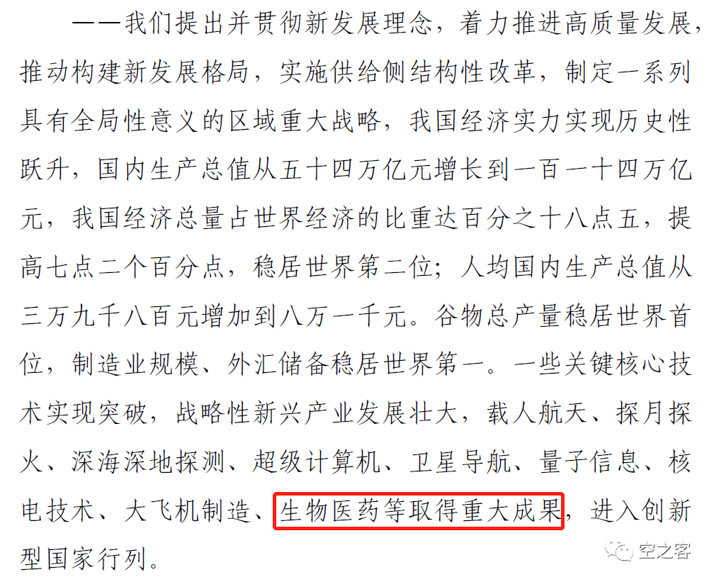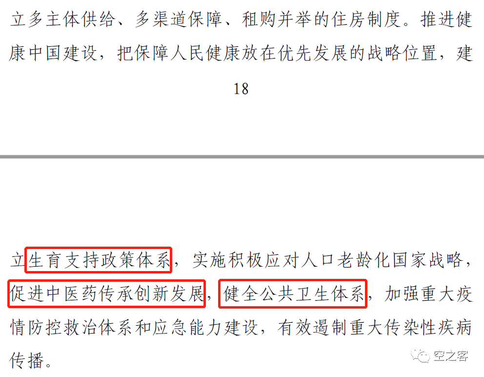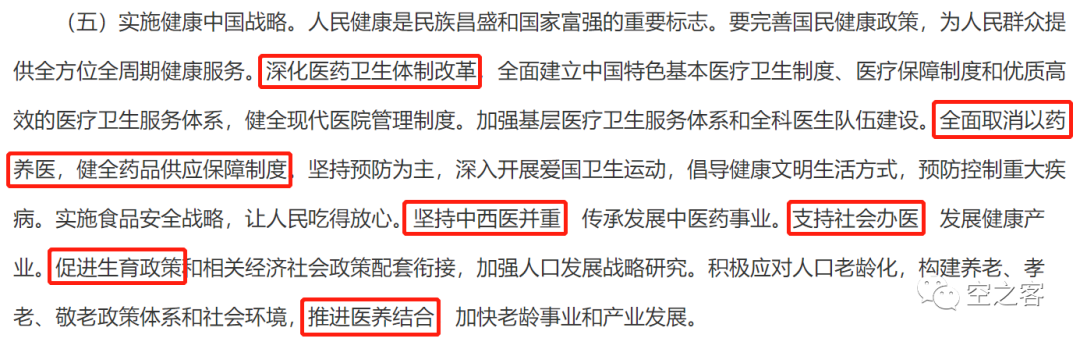 对于重大会议的报告,经常看到“六经注我”的分析解读,毕竟谁都各自能找到于己有利的只言片语,然后截图发圈即可。此种方法,望文生义概率居高不说,往往是同一份报告要被读出一大堆南辕北辙的含义。想要正确进行解码,个人以为最简便直接的方法就是文本格式化后的纵向对比,看同一个话题在前后同规格会议/报告中是如何表述的,重点关注其间的显著差异,特别是明确升格、降格和关键词改动,往往就是新文件真正要强调的意图。 我们就不妨从出炉的两次大会报告,来一窥医疗行业可能发生的转向。因全文较长,只能节选与医疗行业有关的段落;又毕竟涉及重大话题,尽量不做个人解读,只做文本描述。在成就回顾章节共有10个具体段落,分别是经济建设/全面深化改革/民主法治建设/思想文化建设/人民生活改善/生态文明建设/强军兴军/港澳台/外交布局/全面从严治党,在第5段“人民生活改善”中,提到“人民健康和医疗卫生水平大幅提高”。 在成就回顾章节共有16个具体段落,分别是新时代思想/党的领导/实现小康/战略部署/新发展理念/全面深化改革/积极主动开放/人民民主/意识形态/人民为中心/生态文明/国家安全观/新时代强军/一国两制/大国外交/全面从严治党,在第5段“提出并贯彻新发展理念”中,明确肯定“在一些关键核心技术实现突破,战略新兴产业发展壮大,……生物医药等取得重大成果,进入创新型国家行列”,同时也在第10段继续肯定“病有所医”和“建成世界上规模最大的医疗卫生体系”(这与五年前的基本对应)。 在第五章节“贯彻新发展理念”中的第二小节为“加快建设创新型国家”,对创新定义是“前沿”“突破”“前瞻性”“颠覆性”,而创新的成果要求是“科技强国、质量强国、航天强国、网络强国、交通强国、数字中国、智慧社会”。在第四章节“加快构建新发展格局”中的第三小段,明确“建设现代化产业体系,坚持把发展经济的着力点放在实体经济上,推进新型工业化,加快建设制造强国、质量强国、航天强国、交通强国、网络强国、数字中国”。这里是最鲜明体现笔者文本对比方法的案例,可以反复揣摩对比前后五年在这一串并列短语上的最大改动,改的越少越靠前,事情越大。在第五章节“实施科教兴国战略”中的第三小段,明确对于创新的要求是“新型举国体制”“强化国家战略科技力量”“以国家战略需求为导向”,落脚点是在“战略性全局性前瞻性”成果。 在第八章节“提高保障和改善民生水平”中的第五小节为“实施健康中国战略”,重点目标包括“深化医药卫生体制改革”“全面取消以药养医”“坚持中西医并重”“支持社会办医”“促进生育政策和相关政策配套衔接”“推进医养结合”等。在第九章节“增进民生福祉”中的第三小段的最后一部分,重点目标浓缩到三项“建立生育支持政策体系”“促进中医药传承创新发展”“健全公共卫生体系”。同样地,可以反复揣摩对比前后五年对于医疗健康事业发展要求的变化,包括规格、排序、重点方向。对于在中国医疗相关行业的从业者来说,每一次行业的重大转向都意味着面临大规模的机会和挑战。以我个人的观感,本次报告已经对医疗行业所鼓励发展的方向指引非常明确,并且明确应“准备经受风高浪急甚至惊涛骇浪的重大考验”。在党的坚强领导下,希望医疗行业的从业者们都能有幸平稳渡过这一段风浪,依靠顽强斗争打开事业发展新天地。