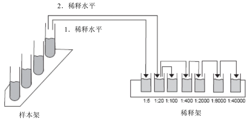需要时,病人样品的稀释由系统用N个稀释液,按多个稀释步骤自动完成(1:5、1:20、1:100、1:400、1:2000、1:8000、和1:40000)。在一些情况下,这样的处理是很必要的。