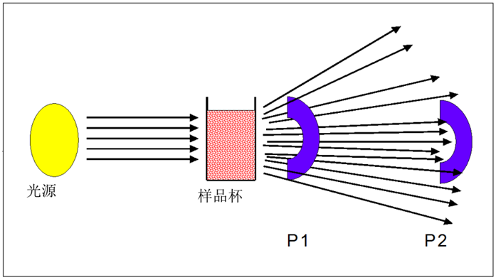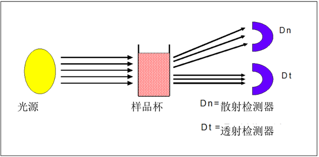 图6、散射比浊和透射比浊仪器不同光检测器位置示意图。