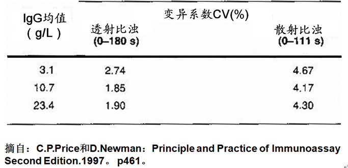 另外,由于进行散射比浊出现的光散射值,检测的是发生散射的光强度。而使用透射比浊的读数,是被免疫颗粒散射后余下的射出光与未经散射前入射光的比值。吸光度读数很大,实际上是被散射后余下射出光的强度很小。因此,在散射比浊仪上检测的散射光强度越高,得到的散射光读数更大。为了让散射仪器可以检出合适的散射光强度,散射比浊必须将检测样品进行很大的倍数稀释后再行检测。而这样的稀释,会需要进行多次。使得最后反应后检测读数的精密度受到很大的影响。散射比浊检测的灵敏度很高,但是检测的重复性有问题!有文章报告(图8),对样品中IgG检测,使用了散射比浊和透射比浊。得到的IgG的均值大致相同;但检测的不精密度还是散射要差得多。