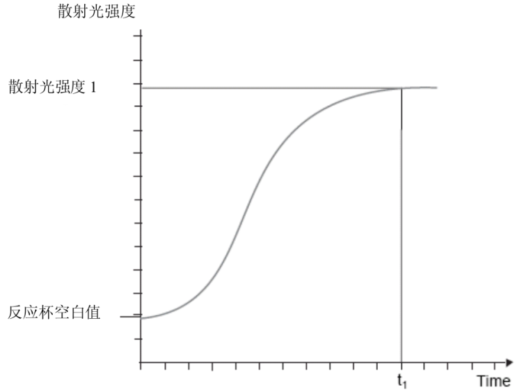 第一个检测模式为终点检测。仅用于某些选定项目,例如以TCA(三氯乙酸)沉淀法检测血清、血浆、尿液和脑脊液内的总蛋白。 该方法学检测抗原抗体反应的最大浊度。然后将检测信号值与校正曲线比较转换为蛋白浓度。 图12、散射免疫散射比浊的终点检测模式 第二个检测模式为定时速率。这个模式,是在两个时间点检测信号间差异,去确定样品内蛋白浓度。 将反应组分转入比色杯后,第一次检测(起始)在约7.5s(t1)。 第二次检测的t2,可在孵育反应6分钟、12分钟或更长时间(依据设定程序)。 计算t2和t1检测得到的散射光强度差,从校准曲线上得到蛋白浓度或其他单位值(g/L、IU/ml)。 图13、定时速率检测 这个方法的优点,是在开始时还没有形成抗原抗体复合物时,通过信号差,扣除了反应组分内因基质散射的干扰。 第三个为全程持续监视(VLinIntegral)检测模式。 VlinIntegral是一个新的数学计算处理,用来评估动力学的凝集反应,例如颗粒增强的免疫分析法或沉淀实验。 这个计算的优点是: