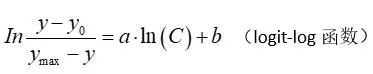 Logit-log曲线 对散射比浊结果的数学处理,很多应用了Logit-Log曲线。将标准品浓度(x)与对应散射光强度(y)各自取自然对数(In),绘制在In x和In y图上。由图上可看到随着分析物浓度的上升,检测散射光强度的变化。如图7-24。该图也称为Logit-Log函数。 图15、Logit-Log函数图 该图表示了检测散射光强度y,与各个校准品浓度C的关系。因为采用了互相取对数表示,反映了免疫反应连续的信号级数变化。 如果logit-log曲线很好,可进行以下计算: 式中:y为检测信号bit值;C为浓度值;y0为最小计算信号;ymax为最大计算信号;a为斜率;b为截距。 y0、ymax、a和b均由电脑计算出来的参数。参考曲线的趋向可由这四个参数描述。