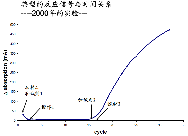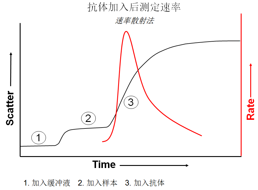 2、反应信号与时间的关系 我借用Mezhmann提供的资料,来说明关系。(图10) 图10、典型的反应信号与时间的关系 由图说明了,在发生免疫反应前,将样品和试剂1加入样品杯,即刻被搅拌。大多试剂1为缓冲液,目的是将样品充分稀释混匀。然后加入试剂2,加入相应抗体,在搅拌下开始了抗原抗体结合产生复合物。产生的免疫散射或免疫透射的检测信号。随着反应时间的延长,检测信号上升。如图所示。 如何处理反应产生的信号?Beckman的ARRAY采用了完整动态处理的速率散射法。如图11。 图11、Beckman ARRAY说明书上图示。为速率散射法。 Dati和Metzmann原先服务于Behringer公司。应该讲,他们参与了整个BN II散射比浊分析仪的开发。在研究免疫散射比浊分析中,很早就注意到免疫透射比浊的可行性。但是,Behringer公司从经济利益着想,将透射比浊放在一边。完整地开发了系列特定蛋白检测试剂、校准品、和仪器。为公司得到了巨大丰厚的经济利益。 在BN II产品说明书内,对免疫散射比浊,介绍了不同情况下蛋白质检测方法学。 说明书说,可以在下列情况下检测抗原抗体复合物产生的散射光: