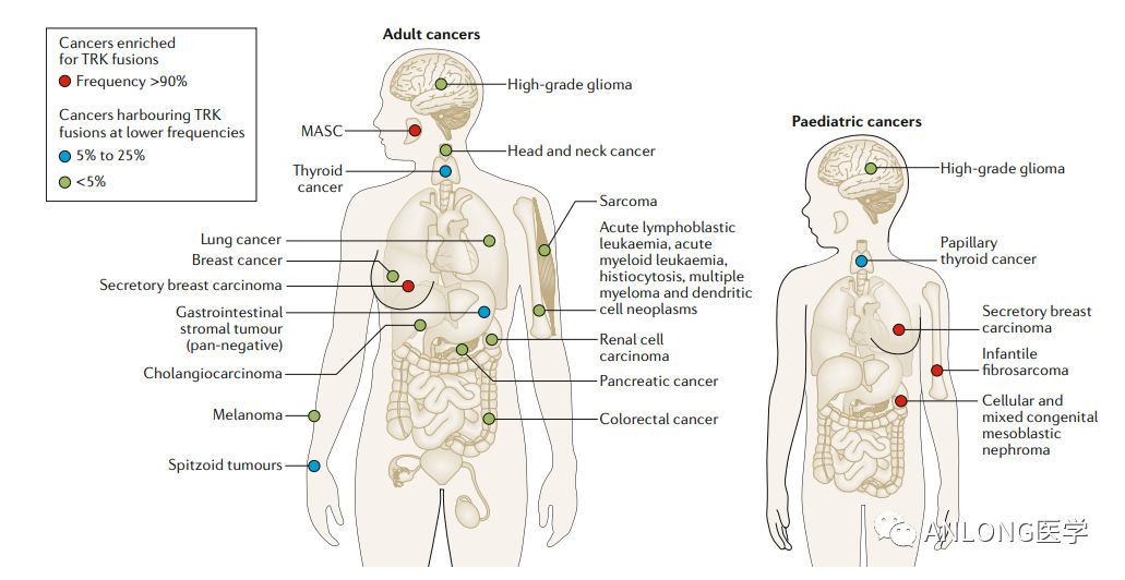 随着“精准医学”时代的到来,肿瘤检测开启了以基因或标志物为适应症的新疗法。目前全球已批准多个生物标志物用于泛实体瘤,包括靶向生物标志物NTRK、BRAF、RET,免疫标志物MSI-H/dMMR、TMB,还有新兴的潜在分子标志物FGFR,开启了肿瘤治疗的新篇章。 靶向生物标志物 国内外已获批实体瘤药物的分子靶点有NTRK、BRAF和RET,相关药物及获批信息见下表。 获批实体瘤靶向药物汇总 NTRK NTRK基因包含NTRK1、NTRK2 和 NTRK3,分别编码原肌球蛋白受体激酶(TRK)家族TRKA、TRKB和TRKC三种蛋白。若染色体内或染色体间发生重排导至NTRK基因家族与其它基因发生融合,便会使TRK蛋白的结构性激活,驱动肿瘤的发生。目前已发现NTRK融合存在于超过45类癌种中,在常见肿瘤类型中的发生率较低,如肺癌(0.2%)和结直肠癌(0.3%);但在罕见的肿瘤中较为常见,如婴儿纤维肉瘤(90.6%)、分泌性乳腺癌(92.9%)、分泌性唾液腺癌(79.7%)、先天性中胚层肾癌(21.5%)等。 NTRK融合在成人和儿童肿瘤中的分布和发生频率 《中国实体瘤NTRK融合基因临床诊疗专家共识》强烈推荐所有晚期成人和儿童实体瘤患者均进行NTRK融合基因检测,并且根据不同癌种的特性采取不同的检测策略。目前NTRK基因融合的检测方式包括免疫组化(IHC)、荧光原位杂交(FISH)、逆转录聚合酶链式反应(RT-PCR)和二代测序(NGS)等。2022年两大NTRK抑制剂拉罗替尼、恩曲替尼纷纷在中国获批上市,开启泛癌种靶向治疗新时代。 1 拉罗替尼 2022年4月13日,NMPA批准拜耳的拉罗替尼(Larotrectinib,维泰凯)上市,用于治疗符合下列条件的成人和儿童实体瘤患者: