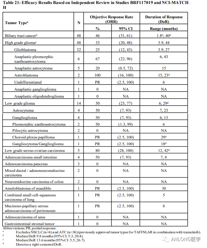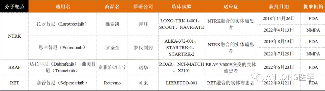 早在2018年11月26日,FDA已批准拉罗替尼上市,用于治疗携带NTRK基因融合的泛实体瘤成人和儿童患者。这是第一个获得FDA批准的不分癌种、只看突变的广谱抗癌靶向药,并被证明在儿童和成人的17种肿瘤中都有效。 拉罗替尼的获批是基于三项大型临床试验LOXO-TRK-14001(NCT02122913)、SCOUT(NCT02637687)和NAVIGATE(NCT02576431)。研究结果显示,拉罗替尼的客观缓解率(ORR)为75%,其中22%的患者获得了完全缓解(CR),53%的患者获得了部分缓解(PR)。 拉罗替尼三项临床试验结果汇总 2 恩曲替尼 2022年7月29日,罗氏制药的恩曲替尼(Entrectinib,罗圣全)获得NMPA正式批准,用于经充分验证的检测方法诊断为携带NTRK融合基因且不包括已知获得性耐药突变,患有局部晚期、转移性疾病或手术切除可能导至严重并发症,以及无满意替代治疗或既往治疗失败的成人和12岁及以上儿童实体瘤患者。早在2019年8月15日,FDA就已批准恩曲替尼上市,用于治疗NTRK基因融合阳性的晚期复发实体瘤成人和儿童患者。 恩曲替尼是一款靶向NTRK和ROS1基因的酪氨酸激酶抑制剂(TKI),具有中枢神经系统(CNS)活性,能够穿透血脑屏障,是临床上唯一一种被证明针对原发性和转移性脑疾病具有疗效的TRK抑制剂,可阻断ROS1和NTRK激酶活性,并导至ROS1或NTRK基因融合的癌细胞死亡。 恩曲替尼的获批是基于三项多中心、单臂、开放性临床试验ALKA-372-001(EudraCT 2012-000148-88)、STARTRK-1(NCT02097810)、STARTRK-2(NCT02568267),试验的主要终点为独立中心审查委员会(BICR)根据RECIST v1.1标准评估的ORR和中位缓解持续时间(DOR),次要终点包括CNS转移患者的ORR和DOR。对NTRK融合基因阳性实体瘤成人患者进行整合分析数据显示,无论基线脑转移状态,成人患者的ORR达到61.3%,DOR高达20.0个月。肉瘤、非小细胞肺癌、涎腺分泌性癌、乳腺癌、神经内分泌癌的ORR也分别高达59.4%、64.5%、84.6%、66.7%和40%。 BRAF BRAF基因位于7号染色体长臂(7q34),是一种重要的原癌基因,编码丝氨酸/苏氨酸特异性激酶,参与调控细胞生长、分化和凋亡等生物学事件。BRAF基因突变是一种广谱的基因突变,在恶性黑色素瘤中发生概率为40%~60%、甲状腺乳头状癌为30%~80%、结直肠癌为5%~15%、肺癌为2%~4%、恶性胶质瘤为3%,并在多种发病率较低的肿瘤包括浆液性卵巢癌、胆管癌、胰腺癌均有一定表达。 根据活化的机制不同,BRAF突变体有三种类型,BRAFⅠ类突变(BRAF V600 D/E/K/R/M 突变),可以强烈激活BRAF激酶活性,组成性活化MAPK通路,且不依赖于RAS作为单体发出信号;BRAFⅡ类突变 ( K601、L597、G464 和 G469等),可作为 RAS 非依赖性二聚体激活下游通路;BRAFⅢ类突变(G466、N581、D594 和 D596等),激酶活性低或缺乏激酶活性,这类突变体依赖RAS并且对依赖ERK反馈的RAS敏感,通过增强其与RAS的结合激活ERK ,并需要分子共存机制使肿瘤中的RAS活化才能起作用。BRAF基因中最常见为V600E突变,占所有肿瘤BRAF突变的95%以上。 BRAF突变类型 2022年6月23日,FDA加速批准诺华的达拉非尼(Dabrafenib,泰菲乐)联合曲美替尼(Trametinib,迈吉宁)用于携带BRAF V600E突变、不可切除或转移性实体瘤的6岁及以上儿童和成人患者,这些患者在先前的治疗后出现进展且没有其他治疗方案。 达拉非尼和曲美替尼均为小分子TKI类药物,达拉非尼能够结合发生突变的BRAF V600E/K/D基因编码的蛋白产物,发挥抑癌作用。而曲美替尼抑制的位点则是BRAF突变激活的下游基因MEK1/2,两者联合可以进一步放大药物疗效。 本次获批是基于3项临床试验中观察到的临床疗效和安全性数据,包括BRF117019(NCT02034110)、NCI-MATCH(NCT02465060)和一项儿童研究X2101(NCT02124772)。 BRF117019和NCI-MATCH的H组研究共纳入131名成人患者,包括24种肿瘤类型,结果显示达拉非尼+曲美替尼在携带BRAF V600E的实体瘤患者中ORR高达80%,胆道癌患者的ORR为46%,DOR为9.8个月;高级别胶质瘤患者的ORR为33%,中位DOR为13.6个月;低级别胶质瘤患者的ORR为50%,DOR范围为6个月至29个月。 BRF117019和NCI-MATCH临床试验数据 X2101研究是一项多中心、开放标签、多队列试验,包括难治性或复发性实体肿瘤儿童患者。研究结果显示,达拉非尼联合曲美替尼的ORR为25%。对于9名有反应的患者,78%的患者DOR为6个月或更长时间,44%的患者DOR为24个月或更长时间。 RET RET原癌基因位于第10号染色体长臂(10q11.21),编码一种具有酪氨酸激酶受体RET蛋白。RET蛋白与配体结合后,可激活下游多种信号途径,如RAS、PI3K、STAT等,参与细胞的存活、增殖和分化。RET基因激活的RET蛋白通过多种信号通路参与不同肿瘤细胞的增殖、凋亡、侵袭,影响肿瘤的发生发展。 RET基因改变和野生型基因过度表达会驱动肿瘤形成,RET基因改变主要包括RET融合和点突变,其中肿瘤的形成主要与RET融合相关。目前已在多个癌种中发现RET融合,包括60%甲状腺髓样癌、10%~20%乳头状甲状腺癌、1%~3%非小细胞肺癌,在食管癌、结直肠癌、唾液腺癌、卵巢癌中的发生概率不足1%。在非小细胞肺癌中,RET基因融合阳性多见于年轻、女性、少量吸烟或不吸烟的亚裔患者。乳头状甲状腺癌中最常见的RET融合类型为CCDC6-RET和NCOA4-RET,而非小细胞肺癌中最常见的为KIF5B-RET。RET融合的检测方法有多种,如IHC,FISH,RT-PCR,DNA-NGS,RNA-NGS等,其中DNA-NGS和RNA-NGS检出率较高(RET基因融合可以用DNA-NGS检测到,但联合RNA-NGS检测可以提高检测灵敏度)。 RET基因主要融合类型 2022年9月21日,FDA加速批准塞普替尼(Selpercatinib,Retevmo)用于治疗携带RET基因融合的局部晚期
