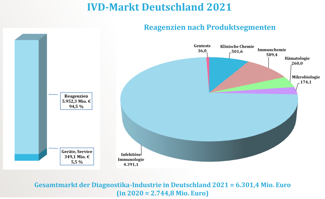 2021年德国国内生产总值3.57万亿欧元,人口数量约8322万,人均国内生产总值4.29万欧元,经济总量位居欧洲首位,世界第四。据报道,德国2021年IVD市场规模约63.014亿欧元,相较于2020年(27.448亿欧元)同比增长129.6%,其中试剂约占94.5%,设备服务约占5.5%。在59.523亿欧元的试剂产品中,细分领域占比如下:传染病检测在德国占近70%的试剂市场,过去20年德国主要的传染病种类有:1)呼吸道感染系列:腺病毒、白喉、流感、百日咳、军团菌、麻疹、腮腺炎、结核、鹦鹉热、脑膜炎双球菌、流血嗜血杆菌4)胃肠道感染系列:弯曲杆菌、诺如病毒、轮状病毒、沙门氏菌、志贺氏菌、伤寒、副伤寒、耶尔森菌、霍乱、李斯特菌6)人畜共患病系列:布病、包虫病、蜱传脑炎、钩体病、Q热、弓形虫、汉坦病毒、隐孢子虫病、旋毛虫病、兔热病、克雅氏病