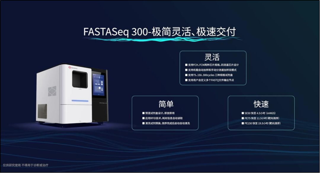11月28日,真迈生物主题为“极简灵活 极速交付”的测序系统新品线上发布会成功举办,正式发布了真迈生物第三款自主研发的基因测序系统FASTASeq 300。 FASTASeq 300沿用了GenoLab M基因测序系统使用的SURFseq测序技术,在此基础之上,采用恒温化学结合“虚拟双单元测序”技术,实现了测序过程无需升降温,单芯片生化反应和信号采集并行,大大提高了测序速度。优化的试剂化学组分和流体设计在保证数据质量的前提下,单位数据产出所需的试剂用量大大减少,有效降低了测序成本。新型高密度测序芯片配合BaseCall算法优化实现了精准的信号采集;核心元器件的国产化,使得成本和供应链更加可控、稳定。 孙雷表示,真迈生物始终以用户为中心来打造更契合用户需求的产品。FASATASeq 300测序系统的技术优化和创新为用户提供了便捷、灵活的工作流程,让用户简单测序,轻松应对各类测序场景。 FASTASeq 300拥有FCH(250M)和FCM(100M)两种规格的测序芯片,芯片的4流道设计可供用户在“机载⾃动加样”或“⼿动分流道加样”双模式间灵活选择,覆盖SE50~PE150等多种测序读长,单次数据产出5Gb~75Gb,同时,FASTASeq 300还支持用户自定义FASTQ文件的输出节点(Multi-time Output, MTO),以上特点都显著提升了FASTASeq 300的灵活性,很好地满足了用户在多应用场景下的实际检测需求。 FASTASeq 300的测序操作简便、快捷。预混式的测序试剂,即放即测,无需按压和额外配置、添加特定试剂组分。应用RFID技术使得所有耗材在装载后其信息被自动读取。测序完成系统器将自动执行下机清洗工作,无需人工值守,真正实现简单操作,轻松上机。 此外,FASTASeq 300还预留了外置废液桶接口可供用户选择不同的废液存储方式,减少废液倾倒操作,方便用户日常使用和维护,提升使用体验。 FASTASeq300拥有极具竞争力的测序速度。以宏基因组测序为例,使用FASTASeq 300 FCM 芯片可最快在4.5小时内完成4个样本的测序工作。使用FCH 芯片则可在8.0小时内完成12个样本的测序工作。灵活、适宜的检测通量降低了用户的开机成本,卓越的测序速度大大缩短了检测交付周期。 FASTASeq 300的成功上市意味着真迈生物成为了全球少数拥有测序系统产品阵列和商业化交付能力的测序系统制造商之一。从基因测序的源头技术创新,到实现全流程自主可控,再到打造满足科研和临床需求的测序产品阵列,真迈生物的成长之路,是以科创力量推动行业高质量发展的真实写照之一。 以真迈生物为典型的基因测序上游企业,始终坚持以自主创新的步伐,推动基因测序技术创新。未来,随着基因测序行业不断发展壮大,基因测序技术将为守护人类生命健康做出更大贡献。 |