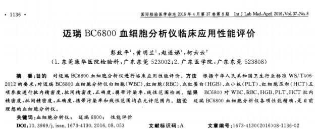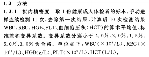 作者 | 张猛单位 | 浙江省立同德医院 今天想跟大家分享的内容是血细胞分析仪的一些科研应用。最初想写的主题是迈瑞分析仪的几点应用技巧和图形分析,后来在查资料的时候,发现了几篇不错的论文,又咨询了几位专家,感觉挺有意思的,便搜索一些相关资料,变成了现在的主题。其中有篇论文是这样的——《迈瑞BC6800的临床性能应用评价》,跟大家一起来分享一下,这篇论文的思路和注意点。 如果是论文作者本人,往往会把重点放在数据、结果和结论上,为了得到好的数据结果,很多时候都是不停的重复实验,经常废寝忘食,甚至住在实验室,不是经常听到一句话吗,科研虐我千百遍,我待科研如初恋。今天我们作为阅读者就恰恰相反,不需要对结果和结论感兴趣,大家也看到了,这最终的结论无非就是仪器还不错。那我们要讲的重点是什么呢?应该是—— 思路和方法! 它的第一步是测量批内精密度,用一份样本,连续测量11次,去掉第一次结果,计算后10次的一些指标,包括白细胞、红细胞、血小板等数据。大家有没有注意到,这里写着要去除第一次结果,为什么呢。好像是自然而然的操作,但是要用语言表达出原因,反而不好说。 我们举个例子,现在还算是冬天,我们淋浴洗澡的时候,会不会打开水龙头,拿着淋浴头将水直接冲在身上呢,当然不会,刚放出来的水多凉啊。应该是先向地上放一会儿,等水温合适稳定后,再冲在身上。对,就是稳定,去掉第一次测量结果,可以更大限度的保障后续结果稳定。 这跟我们末梢测血糖擦掉第一滴血原理差不多。那么能不能像唱歌比赛打分那样,先去掉一个最高分,再去掉一个最低分呢。也是不可以的,这样属于挑数据,而且测量也就不是连续的,使得结果不客观。 第二步,测量批间精密度,取高中两个水平的质控品,连续监测20天,计算在控数据的变异系数,这一步时间稍微长一点,20天。 第三步呢,测量正确度,取10份检测结果在参考区间内的新鲜静脉全血样本,每份样本检测两次,计算20次检测结果的均值,以迈瑞6800的测定均值为标准,计算偏倚。 第四步,测量携带污染率,分别针对不同的检测项目,取一份高浓度的EDTA抗凝静脉血,混合均匀后连续测定三次,再取一份低浓度样本,混合均匀后连续测定三次,计算携带污染率。 第五步,计算线性范围,选取一份接近预期上限的高值全血样本,分别按照这样不同比例进行稀释,每个稀释度重复测定2次,计算均值。将实测值与理论值作比较,验证线性范围。