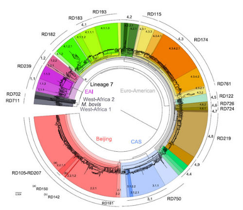 这张图代表了超过1600种结核杆菌之间的关系,最里面一层是七种最主要的结核分枝杆菌复合群。其它亚种标记在里层圆环的外侧,以特定的RD(regions of difference)进行注释。 导至致命呼吸道疾病的细菌为给每个家庭带来了巨大的压力,并且这些细菌对不同的人会造成不同的影响。结核病是结核分枝杆菌引发的疾病,通常与肺部相关,但也会影响身体的其它器官。WHO估计全球约有1200万结核病患者,每年约有130万人死于结核病。 为了鉴定不同的结核病起源,绘制结核病在世界上传播的地图, 科学家们研究了91684个突变基因。 研究发现,对全球的家庭而言,编制结核病相关菌株的条形码只需要62个突变基因。 领导该研究的Taane Clark博士说:“现在,结核病诊断和治疗方向上的新技术越来越受到研究人员的关注。该条形码能够很简单的鉴定出菌株的类型,从而判断它的毒力。我们为结核病研究和治疗相关的研究人员和医生提供了有效的信息,帮助他们很快了解需要对付哪种菌株。” 参与该研究的 Ruth McNerney博士表示,基因组是非常复杂的,我们希望这个简单的“条形码”能够对结核病相关的研究起到帮助。