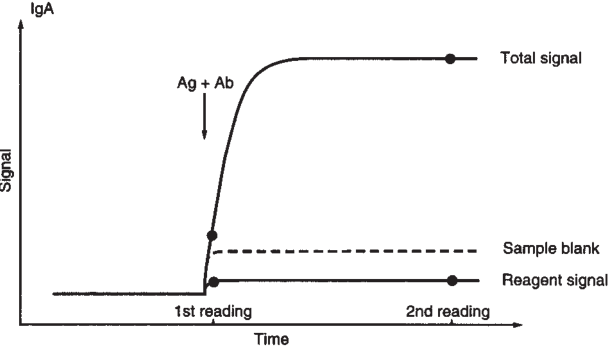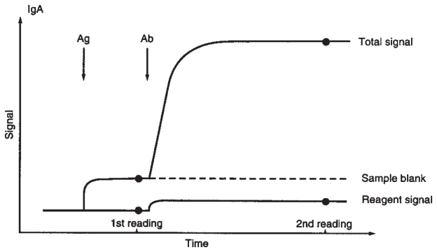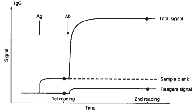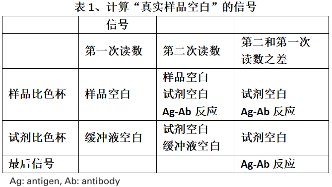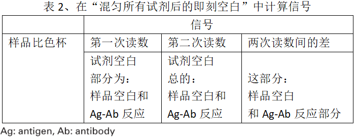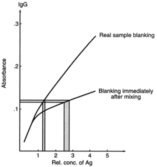 蛋白质标准化 免疫散射比浊和/或免疫透射比浊检测方法的最佳化 冯仁丰 读数原理 现代自动仪器按照关于试剂的混匀和信号的阅读的三个不同原理之一操作。其中两个原理展现在以下离心分析仪上,于340nm得到免疫透射比浊的结果。 a)真实样品空白 理想方式得到最适信号展现在图6和图7. 首先,加入反应缓冲液到反应比色杯。然后,加入样品,与缓冲液混合,在预温阶段最后,读取第一个读数。这是真实的样品空白(图6和图7中标记为“1st reading”),被储存在仪器记忆中。 图6、作为时间函数形成的信号。使用人IgG作为“真实样品空白”示例。 图7、作为时间函数形成的信号。使用人IgG作为“真实样品空白”示例。 下一步,加入专一的抗体,与被预温样品混合。因抗原与抗体间的反应,在很短的时间里形成了浊度。 在信号变得接近恒定,说明反应已经接近终点 — 通常在4-6分钟后 — 读取第二个读数(在图6和图7中标记为“2nd reading”),储存在仪器的记忆中。这个读数是代表样品空白、试剂空白、和抗原-抗体反应的信号之和。 在相同时间间隔,试剂空白在单独的比色杯中以相同的时间间隔平行检测。终点信号代表了,在反应缓冲液和空白样品(如水或盐水)和抗体本身混合引起的浊度。这个值,仅在一个比色杯中获取,被用于纠正来自样品比色杯所有信号。理想地,试剂空白值应非常低。 用于计算的信号可参见表1。 样品比色杯和试剂比色杯的值之差,从第二个读数中减去各个第一个读数(最后一栏)。 在减去试剂空白读数后得到了最后信号。在抗体过剩区带得到了提供的样品读数,最后结果随样品中抗原浓度升高而升高。 在抗体加入前即刻阅读的读数的原理,经常被提及为:真实样品空白或使用样品预温的两个试剂原理。 这个原理展现在图6和图7的两个不同血清蛋白质,IgA和IgG。 b)混合所有试剂后即刻的空白读数 一些自动仪器按照另一个原理操作,混合试剂和阅读信号,如图8和图9所示。 图8、作为时间函数形成的信号。“混合所有试剂后即刻的空白读数”,使用人血清IgA为示例。Ag:抗原,Ab:抗体。 图9、作为时间函数形成的信号。“混合所有试剂后即刻的空白读数”,使用人血清IgG为示例。Ag:抗原,Ab:抗体。 开始,反应缓冲液、样品、和抗体混合。然后,尽快,通常混合后的5-10秒,取第一个读数,并储存在仪器的记忆中,作为空白值。 4-6分钟后,反应已经达到它的终点,取第二个读数,并储存在仪器记忆中。该信号用于如表2所示的计算中。 最后得到的结果简单地从第二个读数中减去第一个读数。 这个原理的优点是,当然,它节约了时间,因为没有了预温,它有些简单。由于没有要求检测试剂空白,经常被作为简单的试剂系统。 但是,这个原理有很严重的缺点。 首先,5-10秒对所有样品稳定和达到一个恒定的信号不总是足够的。这会要求到2分钟。所以,第一个读数会不包括总的样品空白,但仅仅是一部分。 第二,免疫反应已经开始,早期的反应信号被丢失。作为一个“缓慢”的反应系统,如IgA,在与抗体混合后的第一个读数在5秒钟,不是非常严格的(图8)。 但是,作为“快速”反应系统,如IgG,已经反应了一半才取第一个读数(图9)。事实上,许多蛋白质与相应抗体的反应非常快,延误5秒钟变得很关键。在抗原和抗体间的反应是这个时间运行处于最大的速度,所以,很难确定得到第一个读数的点。 “混匀所有试剂后的即刻空白”的实际含义,可容易地通过比较由IgA和IgG的6个标准的信号形成曲线上予以展现(分别为图10和图11)。 图10、以人IgA为例,6个标准以时间为函数的信号发展。Std,标准;R,试剂。 图11、以人IgG为例,6个标准以时间为函数的信号发展。Std,标准;R,试剂。 对于缓慢反应的IgA系统,5-秒钟的延缓不显著。 对于快速反应的IgG系统,在第一个5秒钟期间,有相当多的信号发展。这使得(第一个读数的)秒时间和第一个吸光度读数间有显著差异,看来丢失的信号随标准中IgG浓度增加而增加。 IgA的标准曲线实际上没有被两个空白方式间的差异所影响(图12),但在IgG的标准曲线绘制中有着很大的影响(图13)。这里丢失的信号对较高标准越来越明显,造成要低得多的“较低”的标准曲线。 在图14中,为离心分析仪上第一次读数的时间对标准曲线数据的影响。在离心分析仪达到了它最后速度后的0.5秒时,取第一个读数。由于这个仪器要求4.5秒钟达到完全的速度,图中括号内是抗原和抗体混合后过去的实际时间。 图15为两个不同的空白原理得到的、在IgG标准曲线上的插入。“较低”和“平坦”的曲线,是“混合所有试剂后即刻的空白”得到的,造成分析不精密度有明显增加,因为读数是在反应曲线的陡峭部分进行的,此处在动态和读数时间下的很小变异,会影响检测的不精密度。由于反应是在最大速度下运行的,特别重要的是,所有样品和标准必须确实是在相同时间下读数! 图12、以“真实样品空白”和“所有试剂混合后的即刻空白”得到的IgA标准曲线。 图13、以“真实样品空白”和“所有试剂混合后的即刻空白”得到的IgG标准曲线。 图14、IgG标准曲线。第一次读数时间标准曲线上的插入。 图15、IgG标准曲线。以“真实样品空白”和“混合所有试剂后即刻空白”得到的两个标准曲线上插入的影响。 而且,很重要的要强调,如果病人样品中实际蛋白质的反应速度,与校准品中该蛋白质的不一