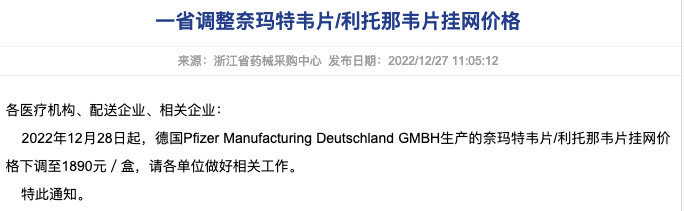 而27日,浙江省药械采购中心消息,根据国家有关新冠药物价格调整通知要求,价格招采中心已将Paxlovid奈玛特韦片挂网价格下调。调整后的价格为1890元/盒,于2022年12月28日生效,相关药品一律“零差率”销售使用。 Paxlovid的适应症是用于治疗成人伴有进展为重症高风险因素的轻至中度新冠患者,一个疗程最多5天。(主要是在病程早期防止进展为重症)。
