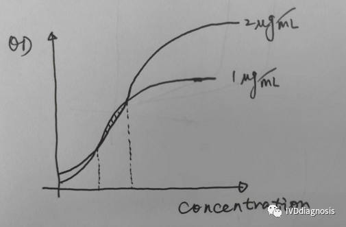 | 在试剂研发过程中,可能遇到一些反常问题,举个例子,比如对于酶免试剂,我们包被1ug/ml和2ug/ml,反应曲线如下:  在某一段区间内,1ug/ml的反应强度是要高于2ug/ml的,这是为什么呢?我怀疑最有可能的原因和空间位阻有关系。 低浓度包被在反应前期给了包被抗体和酶标抗体足够的反应空间,高浓度的包被带来的位阻反而不利于前期的反应,只是带来了后期足够的反应容量。其实,这一点同样适用于免疫层析平台。很多时候我们发现1mg/ml的包被浓度在某一段区间内,反应强度要高于2mg/ml的包被浓度,有的时候表现为灵敏度的提升,有的时候则在整个反应区间都是如此。有些人解释说抗体包被浓度高的话,部分结合不牢固,反应过程中被样本冲走了。其实我觉得,2mg/ml的包被浓度根本不算高,NC膜的蛋白结合量远不止于此,可能不同蛋白与NC膜的结合性能不同,但我只能说,这不是主要原因。并且,对于免疫层析,不知道大家有没有发现,有时候降低标记浓度,同样可以一定程度地提升灵敏度。这又是为什么呢?