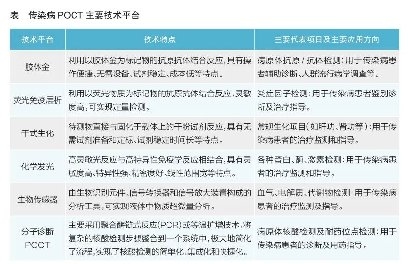 POCT是在采样现场进行、利用便携式分析仪器及配套试剂快速得到检测结果的一种检测方式。POCT通常不需要由临床检验师进行检测操作,在采样现场即可进行分析,可大幅度缩短诊断时间,且在样本用量、样本种类、试剂便利性和操作者专业性要求方面具有较大优势。POCT应用场景广泛,是体外诊断行业最具发展潜力的细分领域之一。技术平台多元化是POCT的一大特点。胶体金、荧光免疫层析、干式生化、化学发光免疫分析、生物传感器和分子诊断POCT等技术平台在传染病防控中均有所应用(见表)。
