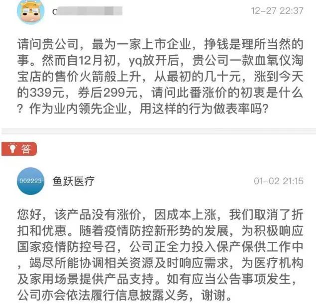 1月6日,江苏省丹阳市市场监督管理局对鱼跃医疗集团进行调查。针对相关情况,前述部门相关人士表示,调查情况属实,但“对于调查进展暂时没有更多消息可以透露”。 据了解,此前该市场监管部门曾对鱼跃医疗的血氧仪涨价问题进行调查。 据报道,鱼跃医疗备受关注的原因,是该公司此前售价94元的血氧仪在消费者需求增加时,其将价格恢复到原销售价格299元。这也让消费者认为鱼跃医疗在“发国难财”。但是鱼跃医疗方面在去年(2022年)12月底给予的回复是“产品价格不由我们制定,主要是商家进行制定”。 血氧仪涨价数倍? 回应:成本上涨取消折扣优惠 据报道,因血氧仪突然涨价、迟迟不发货等问题,医疗器械厂家鱼跃医疗近日争议颇多。1月2日,鱼跃医疗在投资者互动平台接连回答了十余条投资者提问,其中回应了血氧仪涨价、制氧机产能等问题。 针对鱼跃医疗血氧仪的价格,有投资者指出,鱼跃医疗自2022年12月初疫情放开后,电商平台的血氧仪售价“火箭般上升,从最初的几十元涨到今天的399元、券后299元。”更有投资者质疑,鱼跃医疗“血氧仪涨价几倍发国难财,能给上市公司带来多少新增利润?” 对此,鱼跃医疗回应称,公司生产经营合法合规,目前血氧仪没有涨价,因成本上涨,公司取消了折扣和优惠。公司根据相关法律法规建立了合理完善的价格管控机制,保障疫情相关产品合法有序供应。 据了解,鱼跃医疗对血氧仪售价上升的原因,归结为“成本上涨”,但有部分知情人士表示,血氧仪原材料成本上涨到18元,而出货价35元左右,“算上3倍营销成本,也才100元价格合适”,但是鱼跃医疗血氧仪售价却在299元,“因此不太合理”。 而从另一家血氧仪供应商康泰医学的财报中注意到,一台血氧仪售价为41元左右,但平均零售价为64.74元/台,远低于鱼跃医疗的299元/台血氧仪售价。 不过在京东平台鱼跃医疗京东旗舰店上,记者以血氧仪作为关键词搜索了解,299元/台的血氧仪已经出售一空。记者注意到,泰康医学的指夹式血氧仪目前价格为128元,康恒医疗同类产品为199元。 在京东旗舰店上,鱼跃医疗的血氧仪目前已被销售一空 据记者了解,鱼跃医疗近期备受各界关注,主要是围绕该公司生产的血氧仪售价产生的“发国难财”等问题,其中去年(2022年)12月28日,有网友在网络上反映,自己购买的鱼跃医疗制氧机在即将到货时被卖方召回快递,但最后以鱼跃医疗致歉和补充发货告终。不过记者也发现,鱼跃医疗对于该消费者致歉的微博已删除。 此前对于相关抗疫物资涨价等问题,鱼跃医疗方面曾采取过强硬措施。2020年,鱼跃集团微信公众号曾发布《防控保障:鱼跃医疗CEO吴群致员工信》,该文章明确提出,“鱼跃医疗产品不得涨价,严格控制经销商与零售体系价格,请相关同事务必通知到位,不得有误”。不过在此次血氧仪风波中,鱼跃医疗并未对血氧仪涨价等行为进行“发文警告”。 作为一个以家用医疗器械为主营业务的上市公司,鱼跃医疗在新冠疫情发生后,“享受”了一波增长“红利”。2020年,由于无创呼吸机和制氧机大卖,鱼跃医疗营收和净利润分别为67.34亿元和20.68亿元,同比分别增加45.26%和143.27%,这也使得鱼跃医疗将呼吸机与制氧机业务作为企业的核心战略进行发展。 不过,记者留意到,鱼跃医疗并未在2020年业绩基础上再进一步,去年全年,鱼跃医疗业绩就出现下滑现象,其中海外业务销售额下降是业绩下跌的原因;而在去年前三季度,鱼跃医疗营收和净利润同比下跌3.65%(51.16亿元)和17.35%(11.8亿元),业绩进一步走低。 记者还留意到,虽然业绩持续收缩,但鱼跃医疗已将融资目光瞄准境外。去年(2022年)11月,鱼跃医疗对外发布公告称,公司拟发行全球存托凭证(GDR),并申请在瑞士证券交易所上市。 据了解,血氧仪价格风波并未对鱼跃医疗的股价带来太大影响。1月6日收盘,鱼跃医疗报32.49元/股跌0.76%,股价并未出现大涨或大跌。 |