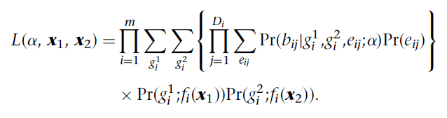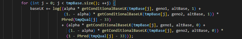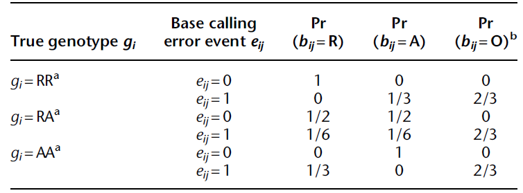 本篇主要和大家分享有关NGS检测体细胞突变时判断DNA污染的方法。 一、 FDA产品- MSK-IMPACT的 DNA污染控制方法 1) 判断样本交叉污染(sample mix-up) 计算参考样本和待查样本间的“不一致比例”,即在参考样本中纯合基因型的位点在待查样本中变成另一个等位基因的纯合基因型的占比。此占比在tumor样本和它们对应的匹配的正常样本间一般应为<5%。相反,和其它个体来源的样本间此占比应高,一般为~25%。具有>5%比例的来自同一个体的配对样本和具有<5%比例的来自不同个体的2个样本被标记成交叉污染的样本组。 2) 判断样本污染 计算次等位位点频率,例如有10个SNP位点,则会有20个染色体,如果均为纯合基因型则次等位位点频率为0%,但有其它样本混入时,如果次等位位点的频率超过2%时,此样本就被列入再评估样本中。 3) 判断配对normal样本中是否存在tumor样本 normal样本不应有常见的已知的SNVs和indels突变。首先,在normal样本中检测已知的热点突变位点,如果一个已知的肿瘤特意的突变位点(例如,BRAF V600E)检测突变频率> 1%时,该normal样本就被列入再评估样本中且有可能从下游分析中排除掉此样本。 二、 判断污染的软件 判断污染的软件根据其目的分为2种,一种是只是检测某个样本是否被其它样本污染,另一种是在判断待查样本是否污染的同时,也能找出污染源样本。以下只介绍一种属于第一类的软件verifyBamID。verifyBamID[1]软件可通过输入一个或多个样本的bam文件,输出样本中的污染比例。该软件的算法如下公式1所示: 公式(1) α:污染比例 x1, x2 :分别为待查样本和污染源样本的遗传谱系坐标 SNP位点个数:总共m个,i∈{1,2,3…m} g1i :待查样本的基因型 g2i :污染源样本的基因型 Di :支持第i个SNP位点的reads数,j∈{1,2,3…Di} eij :表示在SNP位点的位置是否发生测序错误的随机变量,发生错误则为1,未发生错误则为0;eij∈{0,1} bij :覆盖第i个SNP位点的第j条染色体上的在该SNP位点的位置处的碱基类型,R代表reference allele, A代表alternate allele,O代表有别于R和A的碱基类型,bij∈{R,A,O} fi(x) :优化过的第i个SNP位点的人群频率 2.1公式1的逻辑 在指定基因型的条件下(Pr(g1i ;fi(x1))Pr(g2i ;fi(x2))),计算某个SNP位点的所有reads上的碱基类型出现的概率乘积,之后计算所有SNP位点的此概率,将所有这些概率的乘积作为计算α的似然值,通过算法Nelder-Mead使公式1进行收敛,即同时解出α和x1, x2的最佳值。 2.2 Pr(bij|g1i ,g2i ,eij;α) 公式(1)中概率Pr(bij|g1i ,g2i ,eij;α)的计算方法如公式(2)所示,即等于在待查样本中看到各SNP位置处出现各碱基类型的概率和污染源样本中看到这些碱基类型的概率之和。 公式(2) 公式(2)中概率Pr(bij|gi ,eij)的计算方法如下表1所示,在指定的基因型条件和已知的base quality的情况下我们可以推测出各位点处碱基出现的概率。例如,比如一个样本的基因型为RR且未发生测序错误时(eij=0),那么支持这个位点的reads上对应位置处应该出现和RR一样的碱基类型R的概率为100%。当发生测序错误时,那么这个位置上会出现有别于R的碱基类型,因此出现R的概率为0,在剩余3种碱基类型出现和alt(A)碱基一样的碱基类型的概率为1/3,出现有别于R和A的的碱基类型O的概率为2/3。 表1 条件概率Pr(bij|gi ,eij)的计算表 注: a:RR代表纯合野生基因型, RA代表杂合型, AA代表纯合突变基因型 b: O代表有别于R和A的碱基类型,假设有4种碱基类型 2.3 Pr(g1i ;fi(x1))Pr(g2i ;fi(x2)) 公式(1)中Pr(g1i ;fi(x1))和Pr(g2i ;fi(x2))分别代表的是待查样本和污染源样本中在i点处的出现各基因型的概率。在推测出人群频率fi(x)条件下,某个样本的基因型的概率符合二项分布,即gi ~ Binomial(2, fi),因此可根据fi(x)计算出上述2个概率。 2.4 示例 如下表2所示,一个SNP位点的位点名称为rs7525308,在染色体上的位置为45293517(0-based),与参考基因组一样的碱基即ref碱基类型为A,有别于参考基因组的碱基即alt碱基为G。 表2 SNP位点示例 从表3中可知支持该位点的reads总共有10条(见第四列),每条reads上在该位点处的碱基如表3中的第5列信息其中“G”代表和ref不一样的碱基类型,“.”代表和ref一样的碱基类型,第6列表示每个位置处的碱基的碱基质量值。 表3 覆盖rs7525308位点的reads的示例 2.4.1计算Pr(bij|g1i ,g2i ,eij;α)和Pr(eij)值 我们从表3知道第5列各碱基类型出现的概率的乘积即为公式1中大括号内的概率。为了得到此概率,我们首选计算第一个碱基G出现的概率即i=0,j=0时的Pr(bij|g1i ,g2i ,eij;α)和Pr(eij)。前者概率根据公式2计算获得;后者表示该位点的base quality的phred score值。 在第一条read的base为碱基G,该位点的alt碱基为G,假定alpha= 0.0775、第一个样本和第二个样本的基因型分别为RR时、此外该位点的base quality为’>’时LK计算脚本如下所示: 上述脚本中getconditionalBaseLK的算法见表1,比如当基因型为RR且eij=1时,bij上看到G的概率为1/3。Phred(tmpQual[j]-33)中将此位点处的质量值“>”转换成phred值的意思,先将此符号转换成ASCII值,之后减去33后即获得Q-Score值,之后按照以下公式(3)获得测序错误率为0.001258925。因此,公式(1)中大括号内的在RR条件下就等于以下公式中的baseLK值。 公式(3) baseLK=log{{[(0.0775*(1/3)+(1-0.0775)*(1/3)]* 0.001258925 + (0.0775*(1/3)+(1-0.0775)*(1/3)]*0.001258925+{[(0.0775*(0)+(1-0.0775)*(0)]*(1-0.001258925)+(0.0775*(0)+(1-0.0775)*(1/3)]*(1-0.001258925)]}} 2.4.2计算Pr(g1i ;fi(x1))Pr(g2i ;fi(x2))值 根据fi值计算gi1和gi2,因gi~Binomial(2,fi),Pr(g1i ;fi(