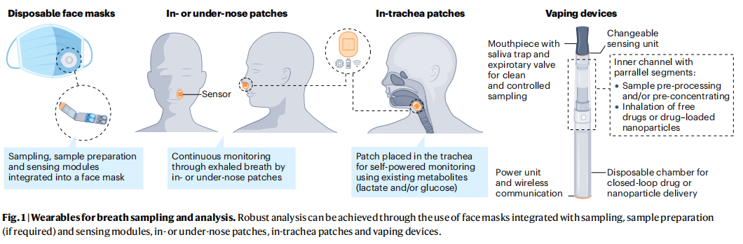 呼吸成分受样本采集方法的强烈影响,但采集方法尚未标准化。分析物的相对比率随着呼吸部分(晚期或末期潮式呼吸)、呼吸模式、样本污染(例如唾液)、样本采集模式(连续或离散)和样本相(蒸汽或冷凝物)的选择而变化。因此,端到端可穿戴设计研究应选择一种允许连续访问生理状态的样本采集策略。例如,一次性口罩可以集成采样、样品制备和传感模块。或者,可以在鼻下贴片或鼻内贴片,或安装在呼吸道上的植入物。传感器集成的汽化装置可以实现治疗应用的闭环药物输送(如下图)。