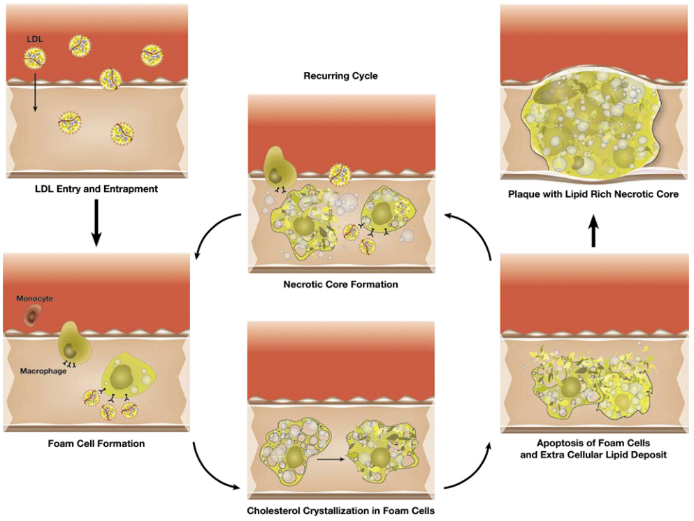 第一阶段(胆固醇结晶-诱导的细胞伤害和细胞凋亡) 局部细胞炎症导至形成富含脂肪的坏死核、一个易受伤害斑块的重要的特征(图3)。该过程由低密度脂蛋白(LDL)进入动脉壁启动,与细胞基质成分主要是甘油氨基聚糖,互相反应引起诱捕,甘油氨基聚糖对载脂蛋白B具有高度亲和力。而且,小而致密的LDL颗粒和基因上确定了血管亲和性,会是关键因子。这个步骤开始于循环血液中进入的单核细胞,转换为巨噬细胞,去吞噬LDL。由于胆固醇增强了巨噬细胞,使巨噬细胞成为泡沫细胞,最后形成了脂肪沟(streaks),造成形成坏死核。在泡沫细胞中,胆固醇结晶,激发一个危险信号,通过一个Nod-like受体NLRP3炎症蛋白,启动了局部的炎症响应。这个过程在形成动脉粥样硬化斑块阶段中,发生非常早。 细胞内的结晶可导至泡沫细胞死亡,促进局部细胞外增加胆固醇,来自细胞膜中以及它们较早吸收的胆固醇载量。这个物质然后形成富含脂肪的坏死核,一旦形成,成为局部脂质混有细胞碎片的堆积物,通常被称为“粥积累。”随着更多的巨噬细胞被趋化现象信号吸引到炎症位点,更多的脂肪被巨噬细胞吞噬,形成更多的泡沫细胞。许多巨噬细胞以后死亡后并释放它们的内含物,诱使更多的巨噬细胞到该位点,由此创立了一个邪恶的循环,最后形成一个饱和的脂肪库。而且,红细胞(RBC)从伤害的血管滋养层填充斑块,提供了更多的它们细胞膜的胆固醇,导至胆固醇浓度更大和饱和。血管滋养层也可被膨胀的尖锐胆固醇结晶伤害,释放RBC进入坏死核。而且,在软组织内游离细胞外胆固醇的存在,已经被证实作为慢性炎症的原因。 图3 伴随反复发作伤害的血管炎症的一个邪恶循环,导至形成一个坏死核和最后易受伤害的斑块。起始步骤是LDL进入动脉壁内,并截留,接着单核细胞进入,摄取LDL成为泡沫细胞。在泡沫细胞内的结晶诱导细胞凋亡,导至进一步吸引巨噬细胞,在动脉壁内形成一个细胞外的脂肪库。然后组成了一个易受损害的斑块基本成分。图各个分图下的说明:左上:LDL进入和截留;左下:形成泡沫细胞;中上:反复发作循坏;中中:坏死核形成;中下:在泡沫细胞内胆固醇结晶;右上:富含脂肪的坏死核的斑块;右下:泡沫细胞凋亡和细胞外脂肪的堆积。 一旦在内和外的易伸缩薄层间动脉壁的狭窄空间内,形成坏死核,然后它遭受局部的物理和化学力的影响。结果,饱和、温度、压力、和pH等,会各个或组合一起,去触发胆固醇在坏死核内的结晶。多个这些物理因素,已经在体外显示了,去触发胆固醇的结晶。更特异的,胆固醇分子的水化,是促发更大体积膨胀的局部因素。胆固醇单水类,已经被结晶图研究确认,作为在人致动脉粥样硬化斑块内的存在的主要胆固醇分子。这样,这些因素的各个或一起,可造成胆固醇结晶化,导至斑块破裂。这些观察也适合急性心血管综合征的未预料的临床表现,看来随着环境压力因素增加了,如:寒冷的气候或强体力活动。 第二阶段(胆固醇结晶诱导的动脉壁伤害) 这一阶段是由纤维斑块盖的危害所产生的全身性炎症。正如展现的,胆固醇结晶化导至坏死核体积的膨胀,可引起斑块破裂和/或糜烂。这个事件然后导至斑块盖的破坏,和叠加(覆盖)内皮,触发了一个系统的炎症响应(图4)。 图4 斑块破裂和/或糜烂的机制。由斑块盖扯裂诱导,导至破裂,在小坏死核的情况下,它导至糜烂。另外,创伤斑块内被斑块内胆固醇结晶伤害血管滋养管,引起斑块内出血。图中内容解释:左侧:血管滋养管;左下:液体胆固醇;中:系统触发;右上:出血破裂;右下:糜烂。 由淋巴在局部产生的白介素(IL)-6分子,是对内膜伤害的响应,然后循环到肝脏和激发产生hs-CRP,这是一个急性相反应素。 斑块破裂会突然地或缓慢地发生,依据脂肪库的大小。较大的脂肪库应趋向于产生突发破裂,因快速膨胀,经常见于男性;而较小的脂肪库应趋向于产生一个缓慢的、较持久的事件,引起糜烂,经常见于女性。他们已经在一个动脉粥样硬化的兔模型上展现了,连续喂食富含胆固醇食物,导至渐进增加hsCRP、IL-6、和纤溶酶原激活剂抑制剂-1。但是,一旦发生斑块破裂,生物标志物上升被考虑较高。 然后,问题来了,是否斑块释放的胆固醇结晶,是因与斑块破裂或事件的实际原因关联的一个被动的过程所致?证据的多个来源建议,这是被惹起的原因。首先,胆固醇结晶被注意到,穿刺内膜不仅在斑块破裂位点,而且在邻近的动脉壁,指示了是一个活跃的过程,涉及的位点超出了破裂点(图2)。而且,在其他冠状动脉内有多处斑块的破裂。第二,在体外研究已经展现了,当一个纤维膜置于不断膨胀的胆固醇结晶的路径处,膜被尖锐的结晶穿刺和扯裂。而且,组织学展现了破裂的纤维斑块盖被磨损的边缘,建议了一个动态的闪光如眼泪那样。第三,在一个动脉粥样硬化的兔子模型的斑块破裂和血栓形成中,存在的胆固醇结晶与血栓形成关联,若缺乏胆固醇结晶就没有血栓。第四,具有严重动脉粥样硬化的患者,但死于非心脏情况的,没有胆固醇结晶穿刺内膜表面。仅死于急性冠脉综合征的患者,具有胆固醇结晶穿刺内膜的证据。所以,我们假设,这个内膜伤害导至了一个系统的炎症响应。而且,我们的胆固醇结晶膨胀模式也解释了突发不断生长动脉粥样硬化斑块的,经常认可发生在患者。在相同患者,他的斑块可静止多年,然后突然出现,他的反复冠状血管造影