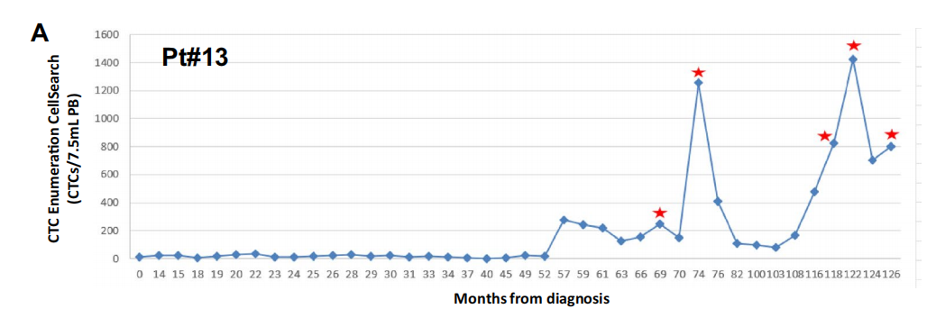 CTC计数结果(红星表示疾病进展的时间)。