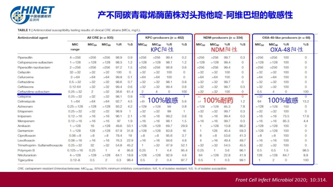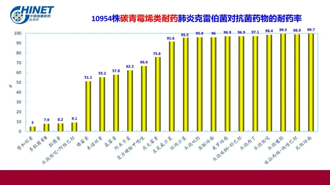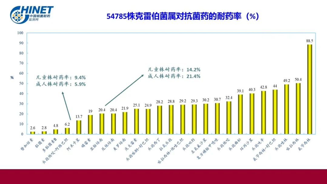 54785株克雷伯菌属对美罗培南耐药率21.9%,对亚胺培南耐药率20.4%,对头孢他啶阿维巴坦耐药率6.2%,对替加环素耐药率2.6%,对硫酸黏菌素耐药率2.8%。10954株碳青霉烯类耐药肺炎克雷伯菌对硫酸黏菌素耐药率8.2%,对头孢他啶阿维巴坦耐药率9.1%,对替加环素耐药率5%。921株难治型耐药(DTR)肺炎克雷伯菌对硫酸黏菌素的耐药率为8.1%,对头孢他啶阿维巴坦耐药率9.7%,对替加环素耐药率1.1%。