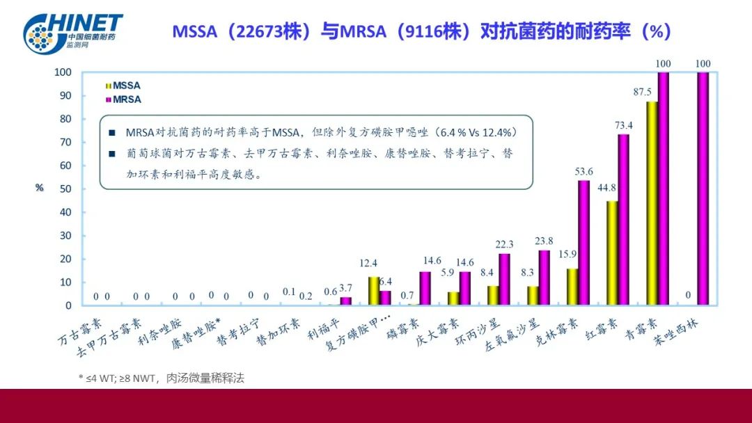 甲氧西林耐药葡萄球菌检出率:MRSA为28.7%,MRSE为82.2%,其他MRCNS为77.6%。MRSA对抗菌药的耐药率高于MSSA,但除外复方磺胺甲噁唑( 6.4 % Vs 12.4%);葡萄球菌对万古霉素、去甲万古霉素、利奈唑胺、康替唑胺、**拉宁、替加环素和利福平高度敏感。