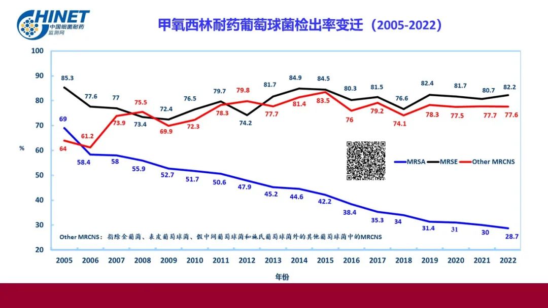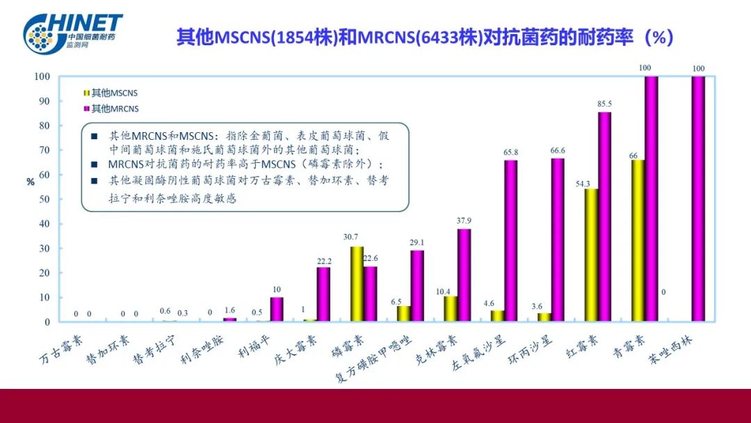 其他MRCNS和MSCNS:指除金葡菌、表皮葡萄球菌、假中间葡萄球菌和施氏葡萄球菌外的其他葡萄球菌;MRCNS对抗菌药的耐药率高于MSCNS(磷霉素除外);其他凝固酶阴性葡萄球菌对万古霉素、替加环素、**拉宁和利奈唑胺高度敏感。