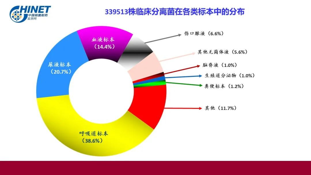 339513株临床分离菌在各类标本中的分布:呼吸道标本38.6%,尿液标本20.7%,血液标本14.4%,伤口脓液6.6%,其他无菌体液5.6%,脑脊液1.0%,生殖道分泌物1.0%,粪便标本1.2%,其他11.7%。
