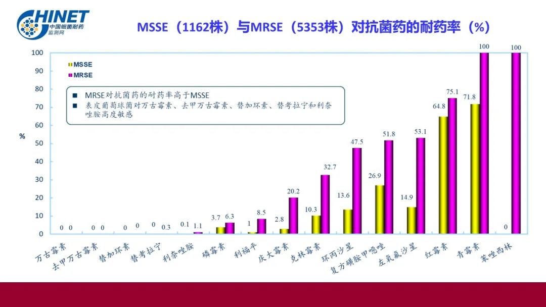 MRSE对抗菌药的耐药率高于MSSE;表皮葡萄球菌对万古霉素、去甲万古霉素、替加环素、**拉宁和利奈唑胺高度敏感。