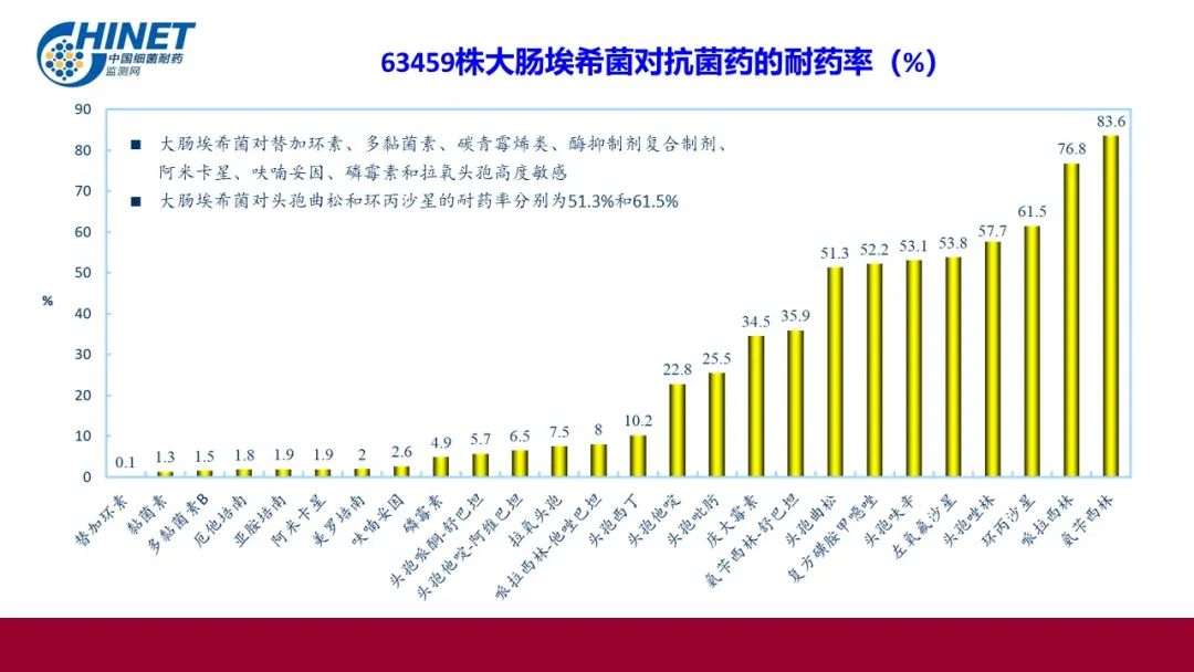 63459株大肠埃希菌对替加环素、多黏菌素、碳青霉烯类、酶抑制剂复合制剂、阿米卡星、呋喃妥因、磷霉素和拉氧头孢高度敏感;大肠埃希菌对头孢曲松和环丙沙星的耐药率分别为51.3%。其中对硫酸黏菌素的耐药率仅为1.3%。
