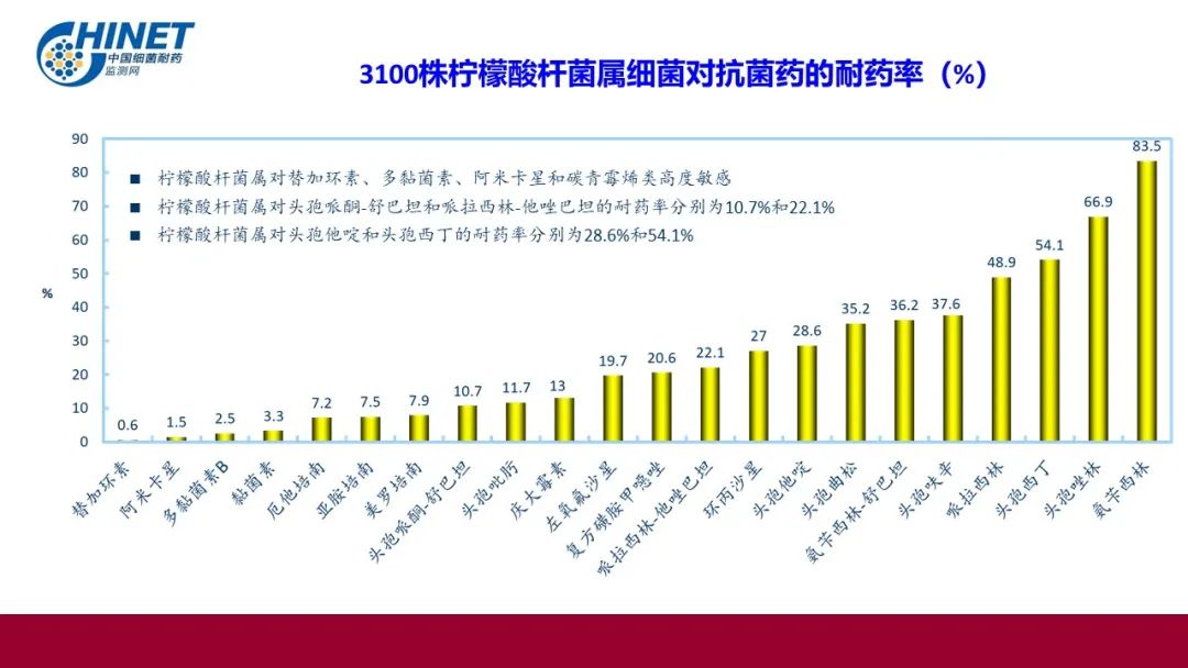 27257株铜绿假单胞菌对亚胺培南耐药率17.6%,对美罗培南耐药率22.1%,对头孢他啶阿维巴坦耐药率7.2%,对硫酸黏菌素耐药率1.7%。6109株碳青霉烯类耐药铜绿假单胞菌对头孢他啶阿维巴坦的耐药率17.4%,对硫酸黏菌素耐药率4.0%。113株难治型耐药(DTR)铜绿假单胞菌对硫酸黏菌素的耐药率3.5%。