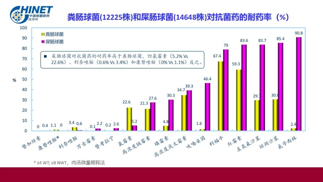 屎肠球菌对抗菌药的耐药率高于粪肠球菌,但氯霉素( 5.2% Vs22.6%)、利奈唑胺( 0.6% Vs 3.4%)和康替唑胺( 0% Vs 1.1%)反之。