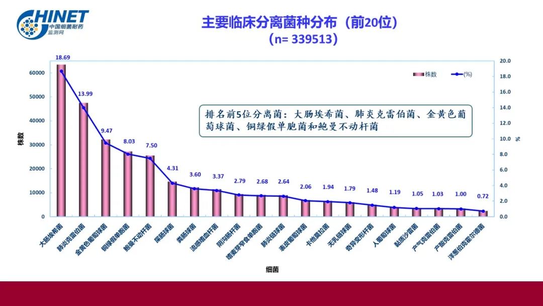 排名前5位分离菌:大肠埃希菌18.69%、肺炎克雷伯菌13.99%、金葡菌9.47%、铜绿假单胞菌8.03%、鲍曼不动杆菌7.5%。