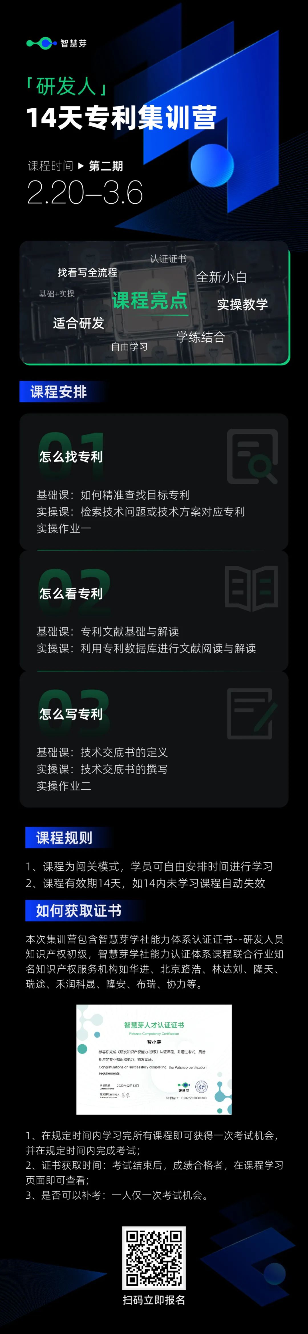 2022年,智慧芽特别上线了专为研发人员定制的“专利集训营”活动!共有1500+小伙伴积极参与,并获得了超多积极反馈! 因此,应众多芽儿们的强烈请求,智慧芽决定于2月20日再次上线第二期“14天专利集训营”系列活动!由于有部分小伙伴反映14天课程周期过长,本次活动特别调整课程安排模式,改为14天内灵活安排,自主“解锁”学习,最快2-3天即可学完哦!课程内容主要分为三大板块:“怎么找,怎么看,怎么写”!手把手教你从“不会找、不会看”的“专利小白”,向“独立完成技术交底书”大佬转变!此外,本次课程由智慧芽学社特别联合华进、北京路浩、林达刘、隆天、瑞途、禾润科晟、隆安、布瑞、协力等行业知名知识产权服务机构共同打造!在课程学习通过后智慧芽还会额外颁发“智慧芽学社能力体系认证证书”,让大家成为有证的研发人!