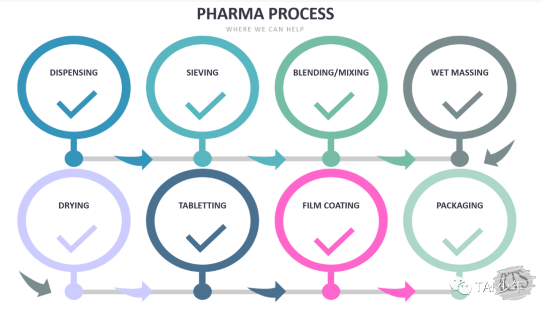 从原料药到药品,中间是至少8道工序:调剂,筛选,混合,颗粒化,提纯,压片,敷膜,包装