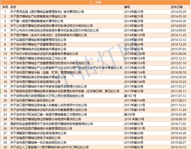 最新汇总指路:https://www.iivd.net/article-23792-1.html 自新版《医疗器械监督管理条例》(国务院令第650号)于2014年6月1日起实施以来,其配套规章及规范性文件陆续出台,大部分于2014年10月1日起正式实施。 以下是国家食品药品监督管理总局已经发布和正在征求意见的系列法规文件,小桔灯网整理如下: |