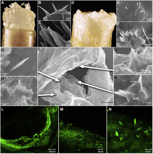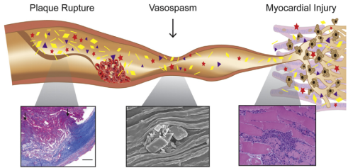 动脉粥样硬化斑块中胆固醇晶体的变化 冯仁丰 最近,我又在美国的临床脂类学杂志中,看到了杂志上刊登的文章“通过结晶摄影观察动脉粥样硬化:在动脉粥样硬化斑块中胆固醇晶体的发展结构如何改变斑块的稳定性”。该文章介绍了很多的胆固醇晶体研究。 文章很长,还涉及了许多病理生理内容。我想借用临床脂类杂志的2020年,刊登的“通过结晶摄影观察动脉粥样硬化:在动脉粥样硬化斑块中胆固醇晶体的发展结构如何改变斑块的稳定性”,将里面多个图片,介绍给大家。这是在胆固醇结晶研究中,最著名的George S. Abela博士写的。 【摘要】 具有动脉粥样硬化病人中降低心血管(CV)事件的残余风险,依然是一个挑战。因此,理解胆固醇如何自发地自组装成亚稳定结构,涉及在动脉粥样硬化斑块内演变为平板胆固醇结晶(CC),以及为什么它们根本地改变了疾病的性质,提供了形成更多治疗的范例。特别是,平板CC,在巨噬细胞的溶酶体内,会成为大至去破裂溶酶体膜,导至组织蛋白酶B释放,和CC碎片直接进入细胞质。在细胞质内,平板CC的表面可以被complosome识别,与组织蛋白酶B一起,触发含有pyrin热蛋白结构域的炎性体。另外,细胞质内平板CC可被补体和在促炎症细胞上的补体和受体识别,较大的片段可诱导“受挫的吞噬作用”,从而使炎症损伤持续存在。此外,在富含脂类的斑块内,亚稳态CC快速转变为大平板CC,可通过斑块坏死核心的扩张,导至创伤性损伤,导至斑块破裂,可能引发进一步的炎症。斑块中的其他结晶,包括尿酸钠和磷酸钙的结晶,可以增强这些过程。因此,进一步限制胆固醇在血管壁上的沉积、减缓平板CC的形成,和抑制晶体诱导的炎症的治疗,可能会进一步降低已确诊CV疾病病人的风险。 尽管现有的治疗有效,但动脉粥样硬化二级预防治疗的最新进展,未能消除心血管(CV)事件的持续风险1-3。更多地了解如何导至发展血管壁(床)中游离胆固醇的积累,动脉粥样硬化斑块的进展和不稳定性,应为开发其他有效治疗策略提供更清晰的依据。 人们认识到,随着脂蛋白在动脉壁中堆积,它们在间质空间中聚集并形成囊泡4.5、或被隔离在巨噬细胞内,巨噬细胞转化为泡沫细胞、并协调持续的低级细胞反应。最终形成简单的纤维粥样斑块,其中含有细胞外胆固醇。有时候,包括中心粒细胞在内的循环白细胞,会被吸引到动脉粥样硬化床中,如果被激活,可能会对包括造成炎症损伤6。此外,通过生长胆固醇晶体(CC)导至斑块核心的快速扩张,可能导至外伤性损伤并甚至破裂7,8。虽然在动脉粥样硬化床中引发和维持炎症和创伤性损伤因子尚未完全确定,但越来越多的证据表明,主要是在常驻的巨噬细胞、间质空间、和富含脂类核心中形成的CC极大地驱动7-10这些过程(图1)。 图1 动脉粥样硬化包括中平板胆固醇晶体的影响。在巨噬细胞中,在溶酶体内的平板CC会大至破坏溶酶体膜,导至组织蛋白酶B(绿点)和CC片段世界释放到细胞质。在细胞质里,平板CC的表面可以被complosome(蓝点)识别,与组织蛋白酶一起会触发NLRP3炎症some。另外,细胞质中平板CC可触发细胞凋亡蛋白酶(红点),激发凋亡。在间质空间,从富含脂类的囊泡和凋亡的巨噬细胞释放的平板CC表面,促进了炎症伤害,由于它们被巨噬细胞的hMincle受体、和被增强炎症小体表达的补体因子C5c和C5b-9识别,促进了选择素的内皮表达,增强IL-1b的趋化作用,并增强循环白细胞的进入。 另外,没有被清道夫细胞摄取的大平板CC,可诱导受阻的吞噬作用,导至持续性炎症。在斑块核心,从凋亡白细胞释放的细胞碎片,可突然改变生理化学环境,加速亚稳态向大量平板CC的转变,导至包括的扩张、血管滋养管出血、和直接损伤,可导至斑块破裂或触发炎症,由于小的CC片段会暴露在间隙空间中。 “通过一个结晶摄影观察动脉粥样硬化”有可能看到,动脉粥样硬化斑块内胆固醇的演变性质,改变了疾病的行为。特别是,它协助解释了动脉粥样硬化斑块内在细胞内和细胞外的游离胆固醇,如何自发地自行组装为亚稳态的CC,为什么它们向平板结构转换易于导至炎症和创伤性伤害成为永久性风险。 图2 从亚稳态到稳定CC的过渡阶段。(图上端)在体外看到经数周形成结晶(分辨率10 μm)。(图下端)体内动脉粥样硬化兔模式内,胆固醇的骨架看来暂时演变为板状。每个阶段变化率受物理化学环境因素的影响。这是对组织进行扫描电子显微镜检查,无需遗传脱水避免溶解CC。相反,组织通过真空脱水,收缩为最小。 图3 结晶过程中胆固醇体积膨大,晶体穿透人冠状动脉和颈动脉的内膜。(A)胆固醇从液体中结晶后在试管边缘上方膨胀(体外)。(B,C)试管中的胆固醇(SEM为扫描电子显微镜)。(D,E,F)CC在试管口(分辨率5 μm)上的纤维膜进行评级。(G,H,I,J,K)为左冠状动脉前降支扫描电子显微镜(中间)低于斑块破裂点。可看到CC穿透内膜表面。(L,M,N)新鲜的颈动脉直接来自手术室,在37℃保存和检查,没有任何组织处理,展现了CC穿孔内膜与上述组织真空脱水的扫描电子显微镜图像相当。Bodipy C-12(invitrogen),一种绿色,对胆固醇具有亲和力的荧光染料,用于突出CC。 (注:图中黄色为胆固醇晶体;红五角星为磷酸钙;黑三角为尿酸钠)。Plaque Rupture:斑块破裂;Vasospasm血管痉挛;Myocardial Injure(心肌伤害)。 图4 与结晶有关的动脉伤害的多步骤概要。1)具有撕裂的纤维帽边缘被栓住的斑块破裂;2)释放的CC向下游移