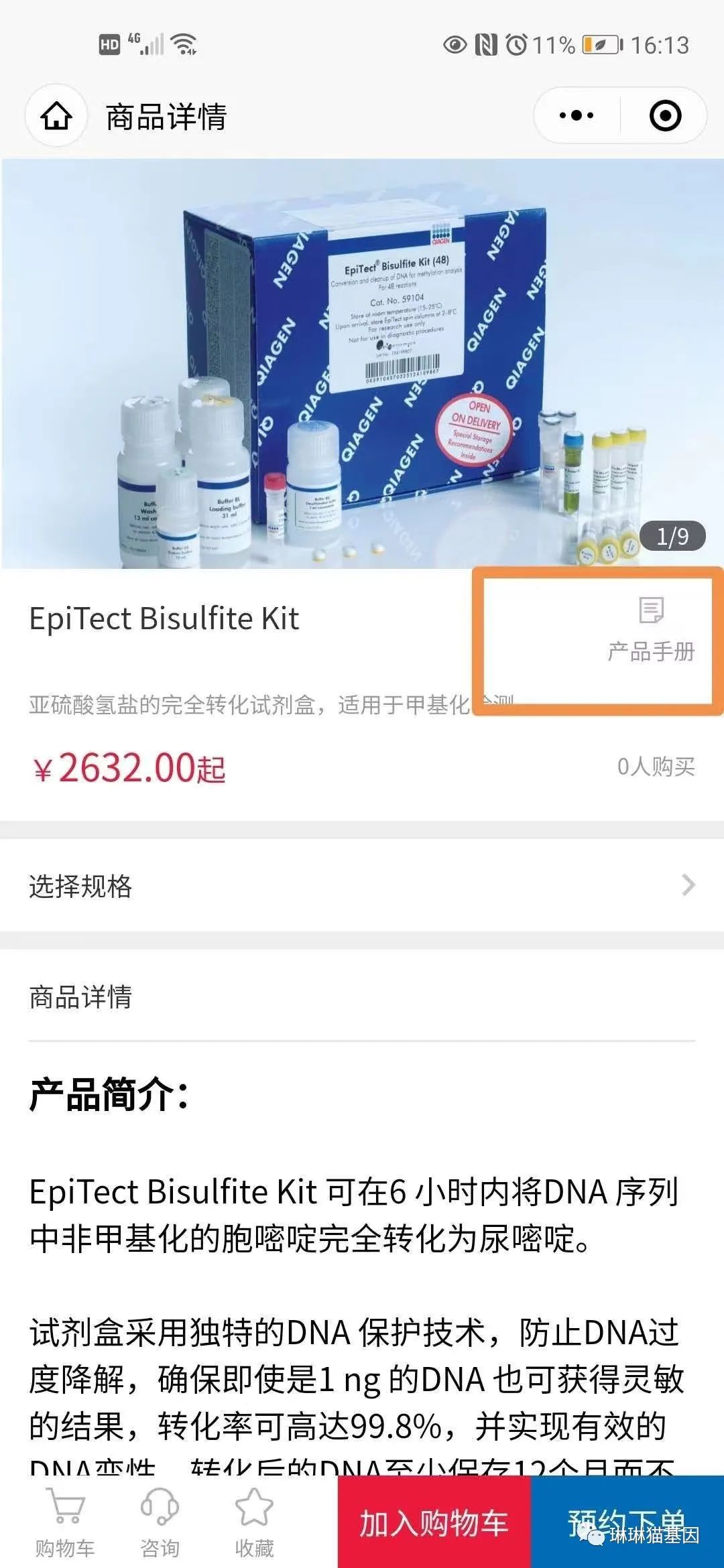1-亚硫酸盐转化,我们买的是大包装59104,也可以问问qiagen小包装货号。(照着说明书操作就行)。这个回收率特别高,降解也不严重,而且转化后的样本保存时间1年。(下面这个图是两年前的,价格已经涨了两轮了)。