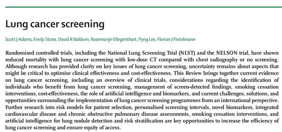 图1:研究主要内容 确定癌症筛查参与者 图2:各个国家肺癌筛查指南 图3:针对吸烟人群和不吸烟人群的研究 图4:既往癌症患者复发癌症类型和比例 肺癌筛查的未来方向 图5:人工只能算法预测未来六年风险 生物标志物 图6:血液生物标志物诊断肺癌的能力 肺癌筛查面临的挑战和机会 肺癌筛查的实施面临的挑战: 包括:参与者的选择、招募方法、图像采集和解释、结节管理和转诊以及结果的沟通等等挑战,例如: