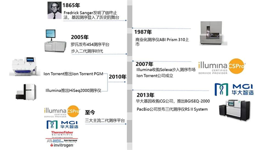 公元前400多年,古希腊的“医学之父”希波克拉底观察到人体内有一种肿胀物能够在体内快速生长,在扩散过程中该肿胀物会伸出许多像手指一样的触角,形似螃蟹,故用螃蟹的拉丁语“carcinos”及“carcinoma”来命名这种疾病。 虽然很早就定义了癌症这种疾病,但直到文艺复兴之后,人们对于癌症的认识才逐渐深入。 著名的苏格兰外科医生约翰·亨特(John Hunter,1728—1793)曾提出,一些癌症可以通过手术治愈,并描述了外科医生如何决定手术治疗哪些癌症。威廉·哈尔斯特德(William Halsted)在1882年进行了第一次根治性乳房切除术来治疗乳腺癌。直到20世纪下半叶,这种外科手术仍然是乳腺癌的标准手术。 本文章从肿瘤的诊疗历史谈起,对肿瘤NGS检测包括NGS测序的历史进行梳理,让大家能够了解这个行业发展的脉络。 肿瘤诊疗的发展里程碑 人类与癌症的斗争从未停止,随着时间的推移,逐步发展出手术治疗、激素治疗、放疗、化疗、靶向治疗和免疫治疗等多种手段。 化疗药物对肿瘤细胞的选择性低,不能分辨肿瘤细胞和正常细胞,对两种细胞均会“格杀勿论,狂轰滥炸”,在杀灭癌细胞的同时也损伤了部分正常细胞,出现“杀敌一千,自损八百”的尴尬局面,且有较大的毒副作用。 靶向治疗就是在治疗癌症的时候,像射箭一样,只针对患病的部分用药,而不伤及健康的部分。而实现靶向治疗的关键是如何找到靶子,也就是需要通过基因检测来找到靶标位置。 免疫治疗主要是激活人自身的免疫系统,让免疫细胞去杀灭癌细胞和肿瘤组织。它直接作用的不是肿瘤细胞或组织,而是激活人体自身的免疫系统,最终杀死肿瘤细胞。免疫治疗也不是针对所有患者都适用,同样依赖于基因检测进行个体化治疗。 吉非替尼(gefitinib,商品名易瑞沙) 最早出现的靶向治疗药物,它的上市过程颇有一番曲折。1998年,一期临床试验发现部分化疗后进展NSCLC患者对易瑞沙反应非常迅速,肿瘤明显缩小。2002年阿斯利康将易瑞沙率先在日本上市,2003年FDA批准在美国上市。然而,在III期的ISEL临床试验中,在1692名患者中,吉非替尼并没有较安慰剂表现出明显的优势。2005年FDA不允许吉非替尼在新患者中使用,基本上宣告了吉非替尼在美国市场的结束。同年阿斯利康也撤回了吉非替尼在欧洲的上市申请。2011年阿斯利康主动宣布在美国市场将吉非替尼撤市。 另一方面,从2004年开始,科研人员发现吉非替尼在某些特定人群中,比如亚洲人群或者非吸烟者人群,有更好的疗效。通过多年的不懈努力,科研人员最终发现吉非替尼的疗效和EGFR的基因突变有关。 并通过多项临床试验奠定了吉非替尼一线治疗在EGFR基因具有敏感突变的局部晚期或转移性非小细胞肺癌中的地位。2009年,欧盟批准易瑞沙用于EGFR突变的非小细胞肺癌的各线治疗, 2015年,易瑞沙又重新回到了美国市场。通过基因检测,将肿瘤病人在分子水平进行分型,可以筛选出药物治疗有效的病人。基因检测挽救了一个投入巨大的药物,更重要的是,给罹患肿瘤的患者带来了新的希望。 随后,以阿法替尼为代表的二代靶向EGFR突变药物上市,让众多患者受益。然而,几乎所有肿瘤都会对药物产生抗药性,导至癌症继续发展。通过基因检测发现,大约三分之二的耐药患者出现EGFR T790M突变,相对应开发的三代药物如奥希替尼可以靶向EGFR T790M突变的肿瘤细胞,进一步延长癌症患者的生存时间。随着研究的不断深入,新的靶向药物不断地被开发,以解决不断进化的肿瘤。任何一款靶向药物的使用之前都需要进行基因检测,以明确患者是否可以从中获益。 O药&K药(Nivolumab,欧狄沃&Pembrolizumab,可瑞达) 除了靶向药物,近年来,基于免疫检查点抑制剂的免疫治疗大放异彩,成为人类在攻克肿瘤道路上获得的新武器。肿瘤细胞通过免疫检查点分子实现免疫逃逸,免疫治疗通过对免疫检查点分子的抑制激活自身免疫反应,消灭肿瘤细胞。 FDA于2011年批准抗CTLA-4的伊匹木单抗上市,用于晚期黑色素瘤患者的治疗,成为全球首个免疫检查点抑制剂药物。PD-1/PD-L1是明星免疫检查点抑制剂,大名鼎鼎的O药(纳武利尤单抗)和K药(帕博利珠单抗)都是PD-1抑制剂。2014年6月O药在日本获得批准用于治疗黑色素瘤,成为全球第一个被批准的PD-1抑制剂;同年7月和9月,FDA先后批准了O药和K药用于治疗黑色素瘤。 PD-1疗法的声名大噪,美国前总统吉米·卡特也助了一臂之力。2015年,91岁的卡特被诊断出患恶性黑色素瘤,而且已经发生了肝转移、脑转移现象,已经是个晚期患者了。卡特经过4个月的K药治疗,脑部的肿瘤神奇般地消失。如今卡特已达98岁高龄,成为美国历史上最长寿的总统。 目前,国产PD-1/PD-L1抑制剂已经有多款产品上市,进入集采后,整体的价格非常亲民,患者大大获益。O药和K药都是可以不区分癌种用药的,这是一个里程碑似的结果。但是,PD-1/PD-L1抑制剂并不能百发百中,解决所有问题。首先,在某些病种中有效率低于20%。其次,有时候副作用比较大,甚至有三级和四级副作用。此外,由于存在免疫超进展,并不是所有人都适合PD-1/PD-L1药物。免疫治疗之前,同样也离不开基因检测,需要在用药前进行MSI、TMB基因检测、免疫超进展相关检测以及PD-L1的免疫组化检测。 随着人类对肿瘤研究的不断深入,抗肿瘤药物的不断发展,对于肿瘤的治疗进入了精准医疗阶段。肿瘤存在高度异质性,不同患者间在疾病进展、治疗敏