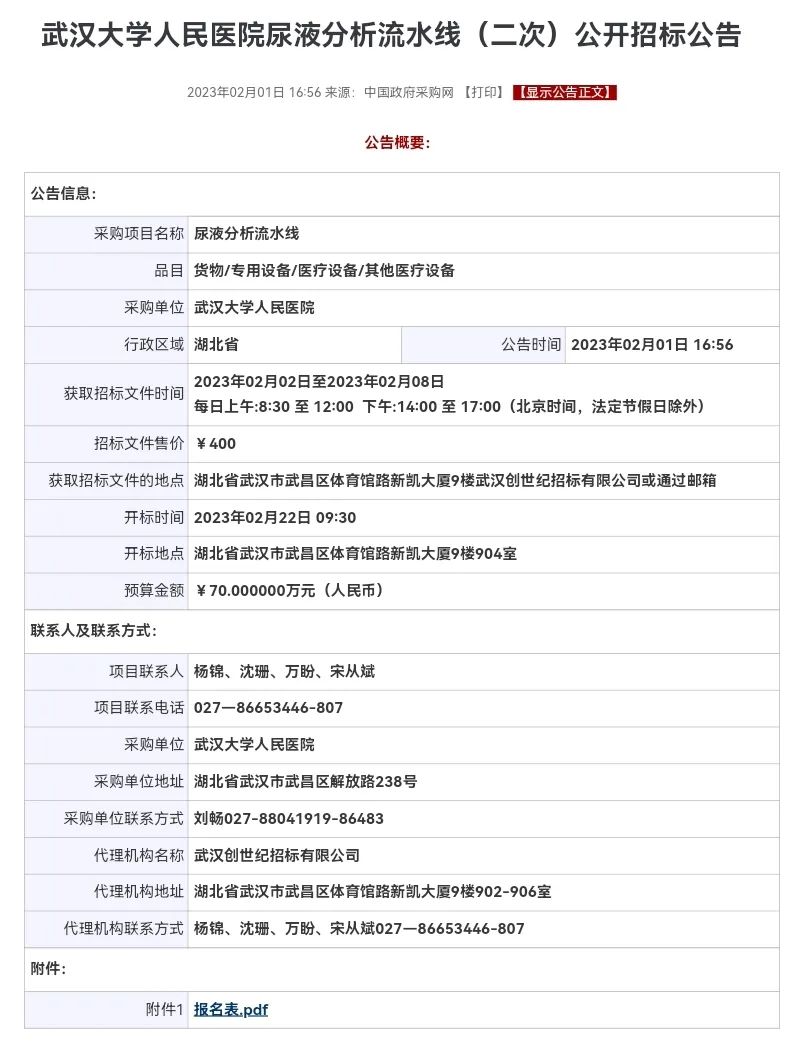 2023年2月25日,中国政府采购网发布,武汉大学人民医院尿液分析流水线(二次)中标公告。 一、项目编号:RMCG-22CSJ-H042/CSJ-1-2022-303(招标文件编号:RMCG-22CSJ-H042/CSJ-1-2022-303) 二、项目名称:尿液分析流水线 三、中标(成交)信息 供应商名称:九州通医疗器械集团有限公司 供应商地址:湖北省武汉市东西湖区长青街田园大道99号 中标(成交)金额:0.0002000(万元) 根据2月1日发布的招标文件,此次招标,预算70万,最高限价60万。 生化免疫流水线低价中标屡见不鲜,尿液流水线投出超低价不多见。 此前,财政部国库司发布《关于《中华人民共和国政府采购法(修订草案征求意见稿)》再次向社会公开征求意见的通知》。 具体包括,支持国产、分散采购取消“限额标准以上”的限制、取消“地方集中采购目录” “部门集中采购目录”的提法 ...同时,新增了“最优质量法”评审法、“创新采购”采购法、明确了“最低评审价法”的适用范围等内容。 第三十五条规定:技术、服务等标准明确、统一的通用货物、服务,已完成设计的工程施工,采用招标或者询价方式采购。技术复杂的大型装备,实验、检测等专用仪器设备,需要供应商提供解决方案的设计咨询、信息化应用系统建设等服务,创新采购以及政府和社会资本合作等项目,采用竞争性谈判方式采购。 随着意见稿的出台,新的招标采购法实施落地,将能有效解决最低价中标问题,是进一步完善市场环境,让企业拿产品质量说话,让过得硬的产品叫得响、站得稳,从而为制造业大国打下产品质量的基础。 |