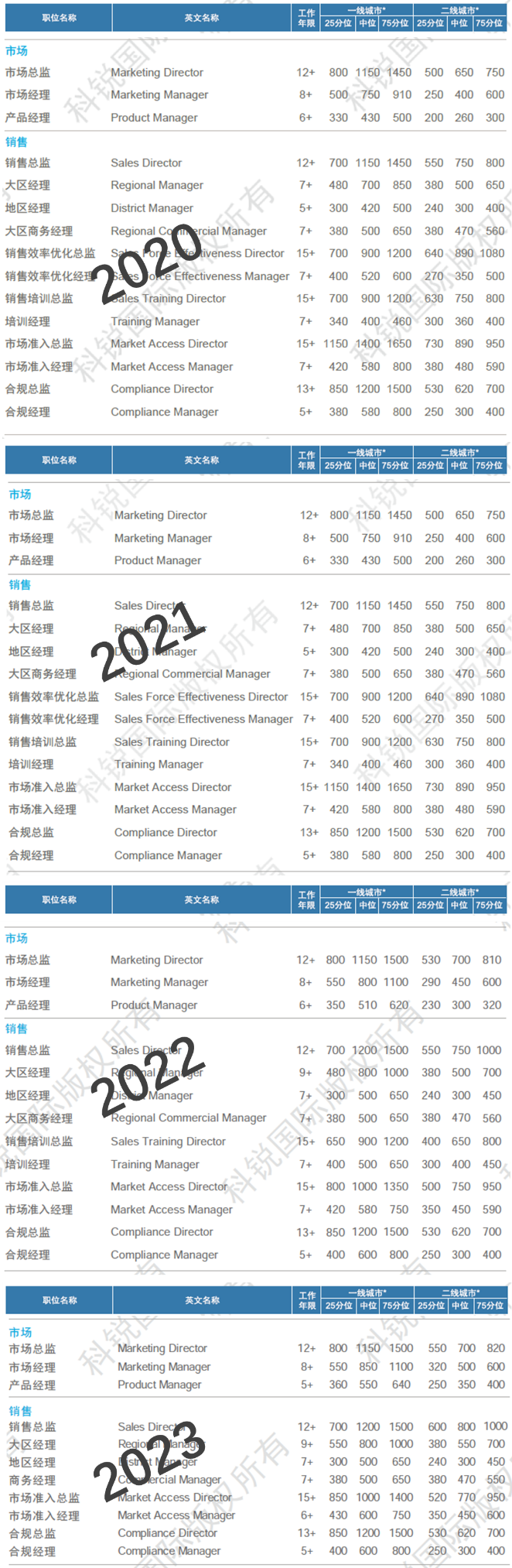 本次我们选择的是科锐国际2020-2023年发布的人才市场洞察及薪酬指南,建议不要纠结数据本身的准确性(毕竟小编的薪资从来没达到中位水平,哈哈,此处强行@小编HR),只要透过趋势变化能给我们带来一点点的启示,那就算咱们没白忙活。