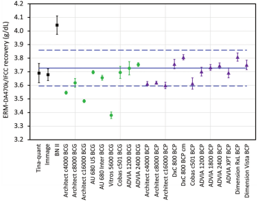 CC的白蛋白检测问题 冯仁丰 背景:血清和血浆白蛋白的检测被广泛地用于医学,包括在肾透析中心中病人护理质量的指示。 方法:收集没有肾病病人的血清(n = 50)、血浆(n = 48),肾衰病人血液透析前的血清(n =53)例。所有样品和ERM-DA470k/IFCC参考物质(RM),以3个免疫化学、9个溴甲酚绿(BCG)、和12个溴甲酚紫(BCP)方法检测。 结果:3个免疫化学程序的2个、9个BCG的5个、和12个BCP的10个方法,回收的RM值在它的不确定度内。一个免疫化学和3个BCG方法相对于RM值有偏移。所有检测程序的随机误差成分很小。选定Tina-quant免疫化学程序为参考检测程序,这是依据回收率和误差分析结果。BCG对于Tina-quant的平均偏移为1.5%到13.9%,在较低白蛋白浓度处更大。BCP方法的平均偏移为-5.4%到1.2%,无论白蛋白浓度。在所有方法类型中,血浆样品的偏移一般高于血清样品。对大多检测程序,进行血液透析病人相对于无肾病病人的血清,偏移较小。 结论:在免疫化学、BCG和BCP间显著差异,影响了血清白蛋白结果的解释。在临床管理肾病和其他疾病的指导和计算,必须考虑进行白蛋白检测的方法,直至实现一致性。 讨论 检验医学溯源性联合委员会(JCTLM)列出了依据免疫检测原理的透射比浊或散射比浊原理,去检出免疫复合物作为血清中白蛋白的一个RMP(20)。ERM-DA470k/IFCC被列为免疫检测校准的一个认证 RM。我们使用Tina-quant透射比浊免疫化学检测程序作为RMP,去确定检测程序和样品类型间的相对偏移,因为它在RM中具有出色的白蛋白回收,和很小的随机误差成分。在其他2个免疫化学方法间,Immage散射程序具有与Tina-quant详细的性能,但BN II对于RM值和Tina-quant程序,在所有样品类型中有显著的正偏移。这些观察隐含了BN II的校准是不正确的,使用一个免疫化学检测原理不可确保白蛋白的准确结果,除非校准溯源性被验证。 一般,BCG方法与BCP方法相比有较高的偏移。BCP方法对于RMP的平均偏移较小,并比例误差的大小不随浓度改变。相反,BCG方法对于RPM的平均偏移较大,呈比例误差随白蛋白浓度而异,在白蛋白较低浓度处有较大的正偏移。另外,在BCG方法与BCP方法间的比较,有较大范围的差异,说明BCG方法在很大程度上被其他样品中的蛋白或物质影响,超过BCP。 依据生物变异指标,在整个生理上合理的浓度范围,没有一个BCG方法符合偏移的最低性能规范。但12个BCP方法的8个符合了偏移的最低性能规范,没有这样的BCP方法的偏移通常比BCG方法观察到的要小。我们的数据说明,BCP方法对白蛋白有较好的选择性,具有比例偏移,看来结果的一致性可以达到。但是BCG方法随浓度变异的偏移和非选择性,隐含了实用BCG技术不可被一致,应从临床实验室中消除。 使用肝素处理的血浆的检测,在BCG方法中产生错误结果,已在以往报告中观察到(24,25)。本研究的的所有检测,除了Immage散射程序外,均被美国FDA批准,可使用血清和肝素化的血浆样品。我们的观察建议,特异性问题与肝素化样品有关,将继续是近期产生的BCG方法的问题。 24个检测程序中的19个,声明具有校准溯源性到ERM-DA470k/IFCC或它predecessor的ERM-DA470血清的RM。在实施校准溯源性做法中的差异,看来归因于偏移。但是肾病的还是非肾病的在血清或血浆间,结果的差异也支持了白蛋白方法,作为suffering因选择性的局限性,在样品类型间也不同。 血清和血浆白蛋白使用染料技术实现一致的结果,将要求规定单一试剂类型。我们的数据支持BCP作为优选的方法,因为相对偏移小于BCG方法,并在整个检验的浓度区间是恒定的,但BCG方法在整个浓度区间不呈比例的偏移,使得标准化不可能。 所有BCP和9个BCG方法的6个,回收ERM-DA470k/IFCC RM靶值很相似。病人样品和未稀释的和稀释的RM,免疫化学的和BCP对于RMP结果,具有类似的关系,看来RM适合用于这些方法。但是,稀释的RM结果在BCG方法,具有值得注意的不同关系,所以,稀释的RM会在BCG方法中,与病人样品不可互换。我们不知道,在校准溯源性方法中稀释了RM被厂商使用;如果使用了稀释的物质,BCG方法具有了互换性的问题。原先预期使用RM分析证书声明是,为校准免疫检测程序,包括关于对染料结合方法的minimal信息,建议了对特定检测程序使用应予以确认。需要进一步研究去确定RM为染料结合白蛋白检测程序的互换性特性。 白蛋白检测程序偏移的差异对病人诊疗有影响。美国的国家肾脏基金会关于慢性肾衰竭的营养指南(The National Kidney Foundation’s guidelines on nutrition in chronic renal failure) 建议进行肾透析病人的白蛋白常规检测(11,26)。在美国的Medicare和Medicaid服务中心,设定了透析病人护理的标准(27)。与前述指导(11)一致,目标(28)是:使用BCG方法检测的(或以BCG方法为(实验室正常的))白蛋白浓度≥ 4.0 g/dl(40 g/L)。 2016年,透析中心被预期,在38%治疗病人中达到白蛋白高于40g/L(29)。对血清白蛋白<35 g/L的病人,中心必须说明证据,计划改善营养。对于病人白蛋白低于该指导值的,应aggressive强烈补充蛋白(30)。补充会不利地影响无机磷、钾、和其他电解质,补充的费用和个人的时间通常nonreimbursable,还没有说明对明确的死亡率好处(31,32)。白蛋白检测没有标准化,使大量透析病人遭受未被证实和耗费治疗的风险。 白蛋白检测程序的选择,肾病样品百分数上产生了很大的差异,与本研究目标一致。BCG方法间,白蛋白目标是≥ 4.0 g/dl(40 g/L),以Advia 2400检测,有32%的样品符合,但以Architect 