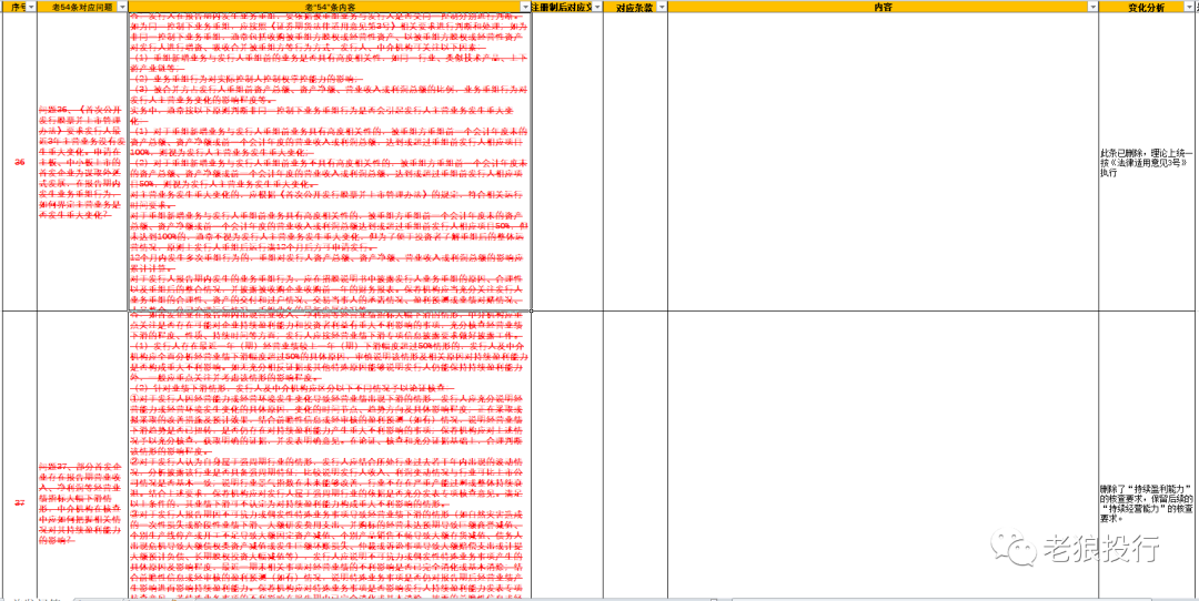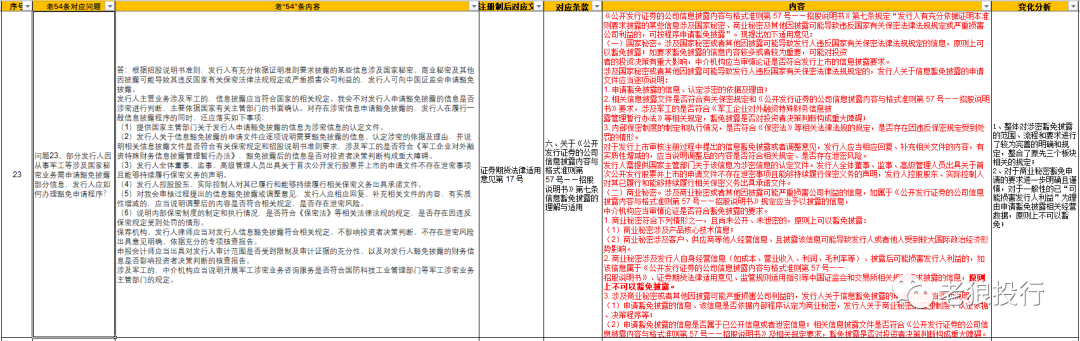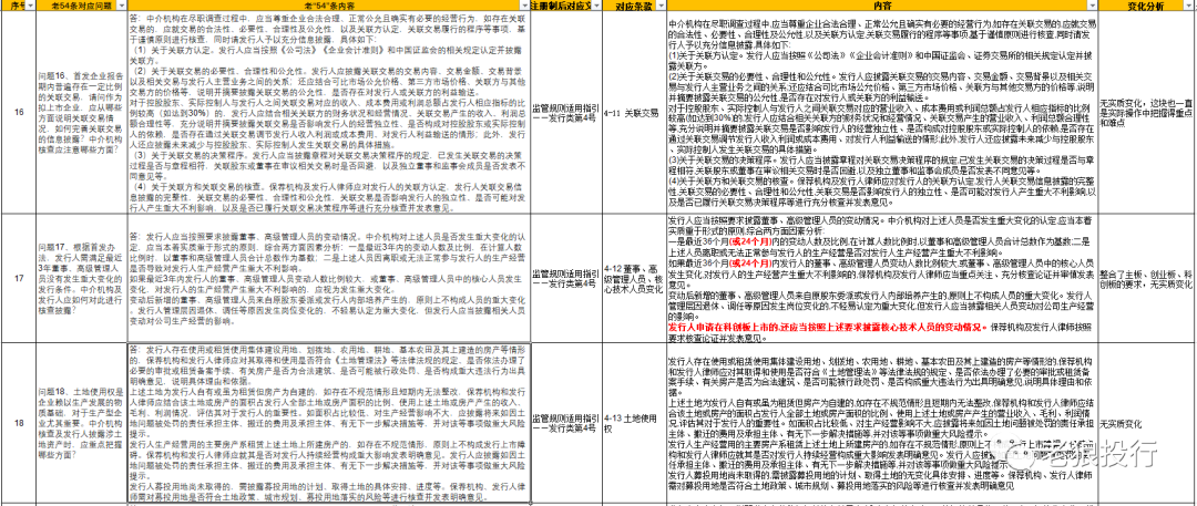 【前言】对投行从业者来说,老“54”条实在太过深入人心,非常有必要以老“54”条为准绳,逐条对比其中的差异,并将简化及删除的内容具体糅合到其他文件的出处也做个详细地阐述。本次修订,也体现了一些目前的审核重点: (1)紧跟注册制强调信息披露、强调针对性和重要性原则的原则,三大板块的规则进行了更新整合,部分较老的监管问答进行了与时俱进的修订; (2)整体的内容较原先进行了精简,部分简单重复或会计准则规定较为明确的简单问答内容进行了删除,如原问答27关于建筑企业工程施工的问题、问答29关于存货减值的问题等;部分已有相关文件规定的内容也进行了删除,如问题36关于主营业务3年内未变更的要求,实质已在《证券期货法律适用意见第3号》中进行了规定; (3)细化了经销业务核查的具体要求,新增的文字篇幅较大; (4)对一些财务处理实务中不够明确的问题进行了细化,比如股份支付的确认、等待期问题等。希望作者此文能对各位看官有所助益,不胜欢喜。 |
