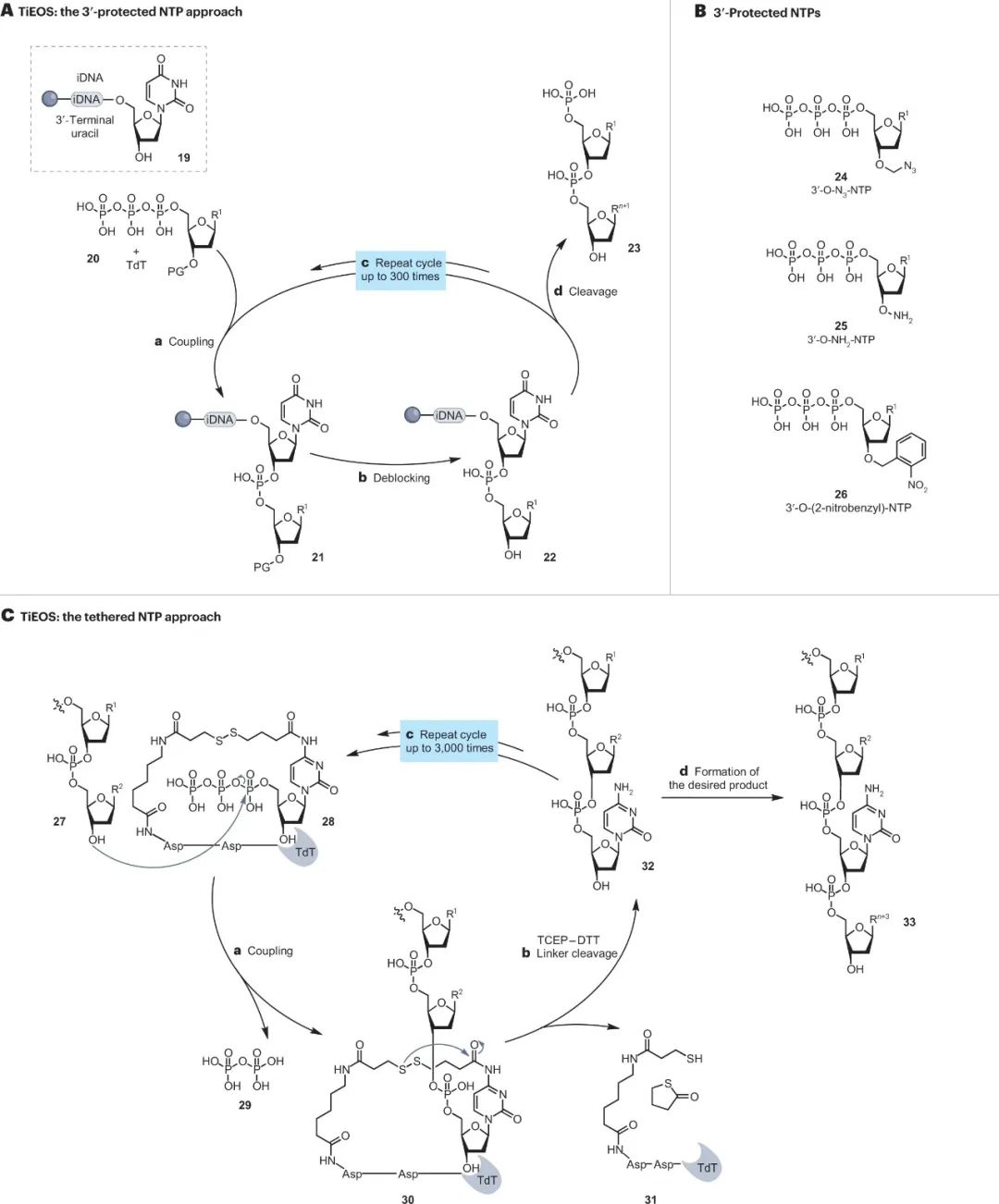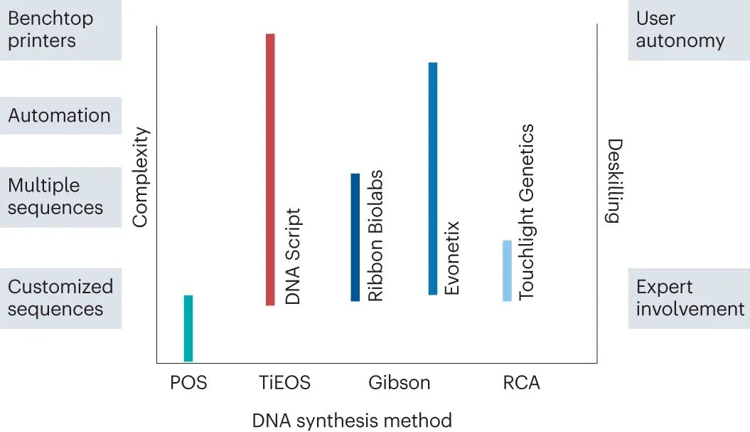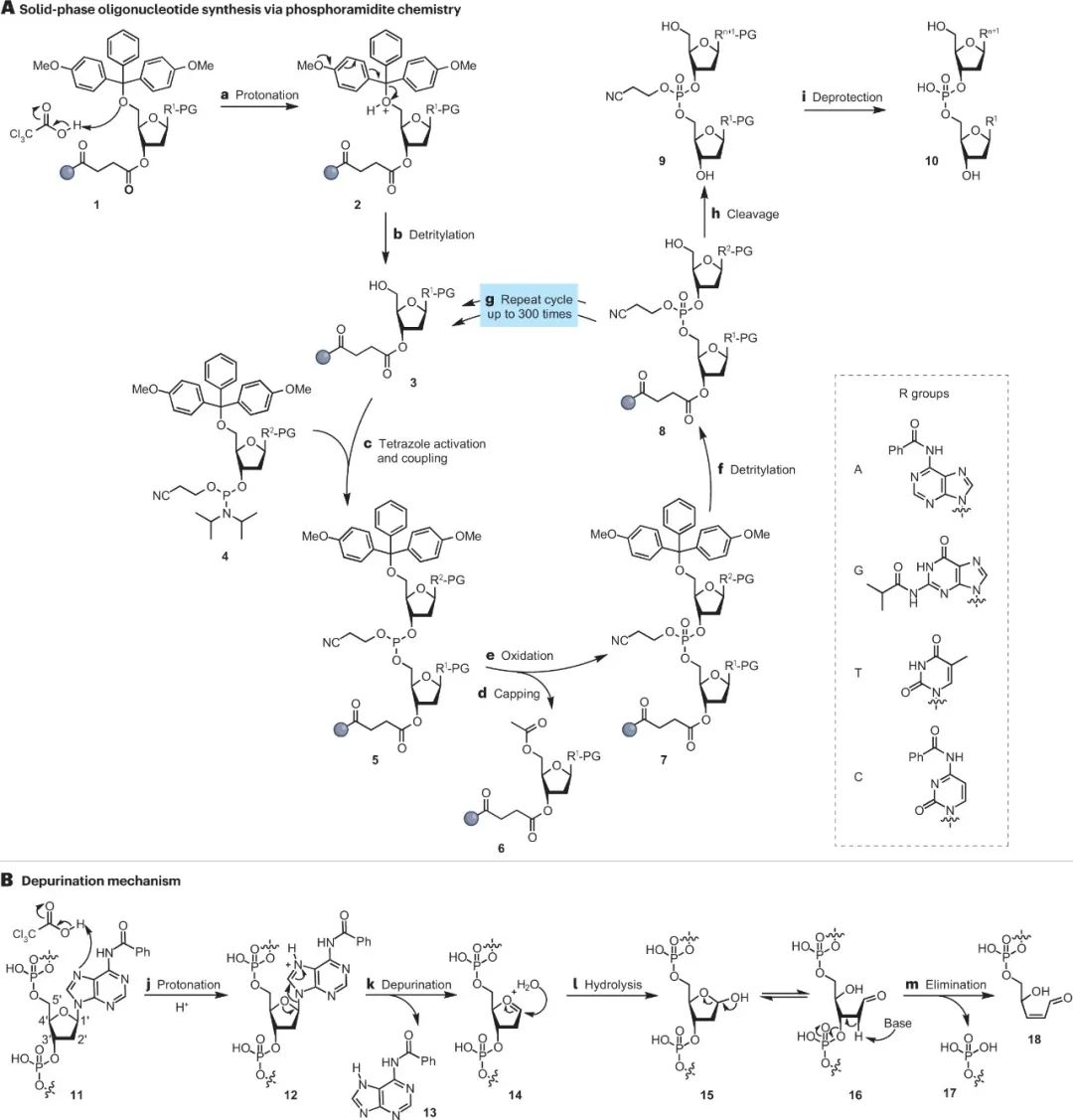 许多研究和商业活动部门对合成 DNA 的需求不断增加。如果能够大规模并低成本地提供 DNA,工程生物学、治疗、数据存储和纳米技术将能获得快速发展。受到下一代测序和基因编辑技术成功的刺激,DNA 合成已经成为一个新兴行业。然而,>200 bp 序列的合成仍然负担不起。为了克服这些限制并开始像读取 DNA 一样有效地编写 DNA,已经开发了替代技术,包括分子组装和克隆方法、模板非依赖性酶促合成、微阵列和滚环扩增技术。 DNA是生命的信息库。自发现以来,它已成为化学、生物学和材料科学的重要研究工具。在过去的二十年中,我们在从合成基因组生成包括活体微生物在内的生物系统方面取得了显着进步。这一成功的结果是,对 DNA 的需求不断增加,推动了新技术的发展,以提供更高纯度、更高数量和更低成本的 DNA。这些要求已将商业重点转向提供合成 DNA,而不是从天然来源分离 DNA。 逐个核苷酸顺序合成多核苷酸的能力允许控制 DNA 的组成和大小。合成 DNA 序列为研究人员提供了一种多功能工具来探测生命系统,而不是依赖于从生物体中分离出的自然序列。此外,对于某些应用,例如扩增无法访问的序列,合成 DNA 便成为唯一可行的选择。DNA 合成技术的发展也可能与材料科学和纳米技术相关,例如,在 DNA 折纸中,使用非天然核苷酸或非天然骨架(例如异种核酸xeno nucleic acids(XNAs))创建新型 DNA 结构和功能。 同样,同聚多核苷酸、共同嵌段和任意多核苷酸的合成不断发展,比如在单链 DNA 作为纳米级设备或基因组工程的支架或供体材料的应用中。 下一代测序 (NGS) 的创新改进了 DNA 的读取和编辑并彻底改变了细胞和群体基因组分析,这些分析现在已应用于“大型基因组”计划。DNA可以被大规模和低成本地进行分析。然而,缺乏大规模的 DNA 合成仍然是技术进步和基因组结构和细胞功能的大规模分析的障碍。这一障碍凸显了发达的读取 DNA、识别和测序基因组的能力与欠发达的编写 DNA 以及合成和产生无限长度和复杂性的 DNA 序列的能力之间存在的差距。 在当前 DNA 合成商业化的环境下,企业要么提供他们自己合成的 DNA,要么提供即用型自动合成仪器,供研究人员在自己的实验室中制造 DNA。这两种途径都使那些缺乏专业合成技能并因此缺乏 DNA 合成“低技能”的最终用户可以进行 DNA 合成。然而,通过去技能化广泛获取合成 DNA 可能会导至合成 DNA 的滥用,这就需要进行监管以减轻滥用造成的潜在危害。 在这里,我们回顾了现有的和新兴的 DNA 合成技术,重点是工业上开发的方法,作为加速长链合成 DNA 供应的一种手段。我们还讨论了 DNA 合成为商业化带来的挑战和机遇。 为什么选择 DNA——经济驱动力 工程生物学有望为全球资源可持续性挑战提供解决方案。工程生物学的进步已经通过建立有效的合作伙伴网络和投资于自动化来满足行业需求。事实上,全球经济中所有制造业投入的 60% 可以通过生物方式生产,而 30% 的研发支出用于与生物相关的行业。DNA 合成在这方面是不可或缺的,因为它提供了工程生物学的本质——具有所需组成、复杂度和长度的 DNA 分子。 DNA技术的四次浪潮 继 2000 年代初人类基因组测序(第一波 DNA 技术浪潮)之后,“读取 DNA”的能力以超摩尔定律的速度发展,该定律预测晶体管的数量每 2 年翻一番(图 1a)。随着该领域的成熟,第二波浪潮由 DNA 从头合成和 CRISPR 基因编辑等新技术推动,这赋予了“编辑和写入”DNA的能力。这使研究人员能够通过利用读取、编辑和写入 DNA 的能力来“应用 DNA”,用于疫苗、数据存储和药物输送设备等产品或基因组工程以生成具有有用特性的生物体,例如耐热植物。DNA 应用能力的提高带来了大规模合成的需求,以应对从健康安全到环境可持续性等行业挑战。例如,COVID-19 大流行表明,疫苗需求的增长会以多快的速度压倒现有的生产能力。随着 RNA 和 DNA 疫苗继续获得批准用于治疗主要疾病,包括 COVID-19,对大规模生产DNA 的需求正在增长。同样,合成 DNA 可用于能够适应气候变化、缓解粮食安全挑战的植物。活化的 DNA 修复提高了植物对热的耐受性,同时引入合成基因使作物能够在不同条件下更有效地收集养分和水分。因此,有效的 DNA 合成对于缩小 DNA 读写能力之间的差距至关重要。 图 1:DNA 合成的技术更新。 a,以每人每天的核苷酸数量估算的 DNA 读取和 DNA 写入(合成)生产力。灰色箭头表示当前读取 DNA 和写入 DNA 之间的生产力差距。椭圆形虚线突出显示了 DNA 合成行业实现大多数重要里程碑以缩小差距的时间范围。DNA 合成数据(红线)仅适用于基于柱子的合成仪器。图中显示了每个芯片的晶体管数量(摩尔定律)以供比较。该图使用文献中可用的数据。b,报告中讨论的DNA合成技术里程碑时间表。为简单起见,并未显示所有里程碑。NTP,核苷 5'-三磷酸;PCA,聚合酶循环组装;TdT,末端脱氧核苷酸转移酶;TiEOS,不依赖于模板的酶促寡核苷酸合成。 自从首次了解 DNA 的结构(方框1)以来,已经取得了实质性的里程碑,为新产业铺平了道路。四十多年来,人们采取了简短但细致的步骤来建立用于逐个核苷酸逐步合成 DNA 的基础化学(图 1b)。开发了化学方法以可靠地提供短的 <200 个核苷酸的 DNA 链,称为寡核苷酸。这些方法针对自动合成仪进行了优化,成为基因工程和测序不可或缺的工具。在此之后,已经实现了酶促和混合方法