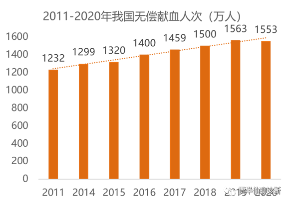 全国无偿献血人次在2019年首次超过1500万大关,达到1563万,2020年为1553万,血液的应急保障能力不断加强,即使在新冠疫情内也能实现临床用血的平稳供应。