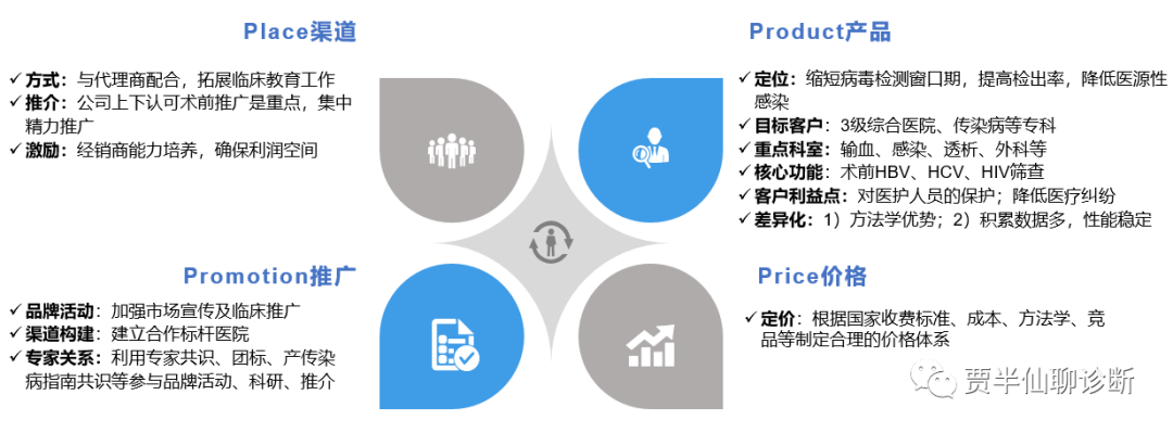 针对术前核酸筛查市场,还处在早期,也就是SO发展性战略,具体不展开。 3) 4P分析